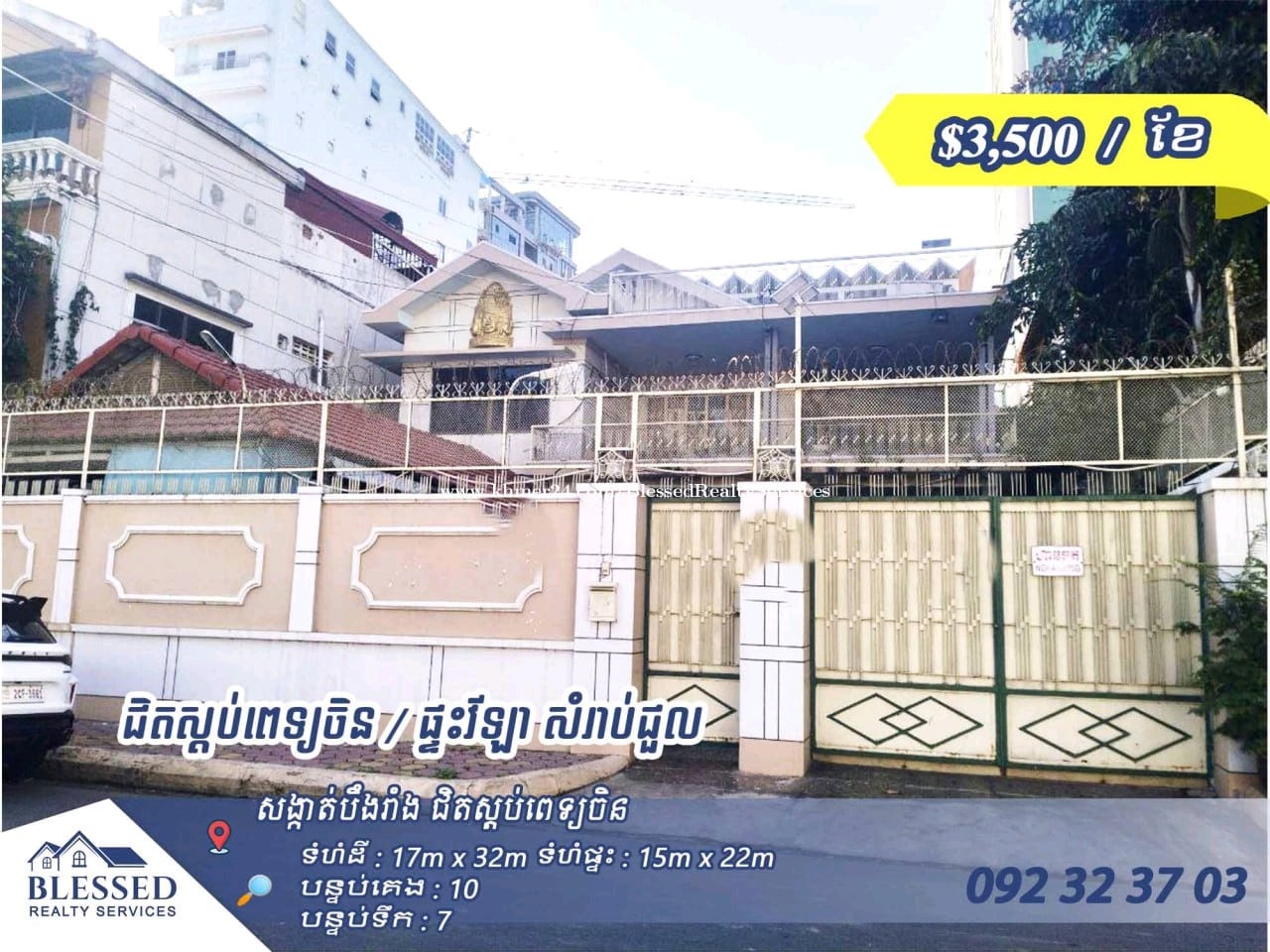 ជិតស្តប់ពេទ្យចិន 💥 ផ្ទះវីឡា សំរាប់ជួល 💥 💰 តម្លៃ : $3,500 / ខែ ✨ ទំហំដី : 17m x 32m ✨ ទំហំផ្ទះ : 15m x 22m ✨ បន្ទប់គេង : 10 ✨ បន្ទប់ទឹក : 7 ✨ ជាន់ : 2ជាន់ 📍 ទីតាំង សង្កាត់បឹងរាំង ជិតស្តប់ពេទ្យចិន ទីប្រជុំជន ជិតសាលារៀន ល្អសំរាប់ស្នាក់នៅ ក្រុមហ៊ុន អង្កា 靠近中国医院 💥 别墅出租 💥 💰 租金:3,500 美元 / 月 ✨ 土地面积:17 米 × 32 米 ✨ 房屋面积:15 米 × 22 米 ✨ 卧室:10 间 ✨ 卫生间:7 间 ✨ 楼层:2 层 📍 位置:位于崩让区,靠近中国医院,地处市区,临近学校,适合居住、公司或机构使用。 📞 Contact: 092323xxxClick To Call ➡️ Telegram: https://t.me/az_chai27 Channel Telegram: https://t.me/rent_blessedrealty License Number: E-25-030