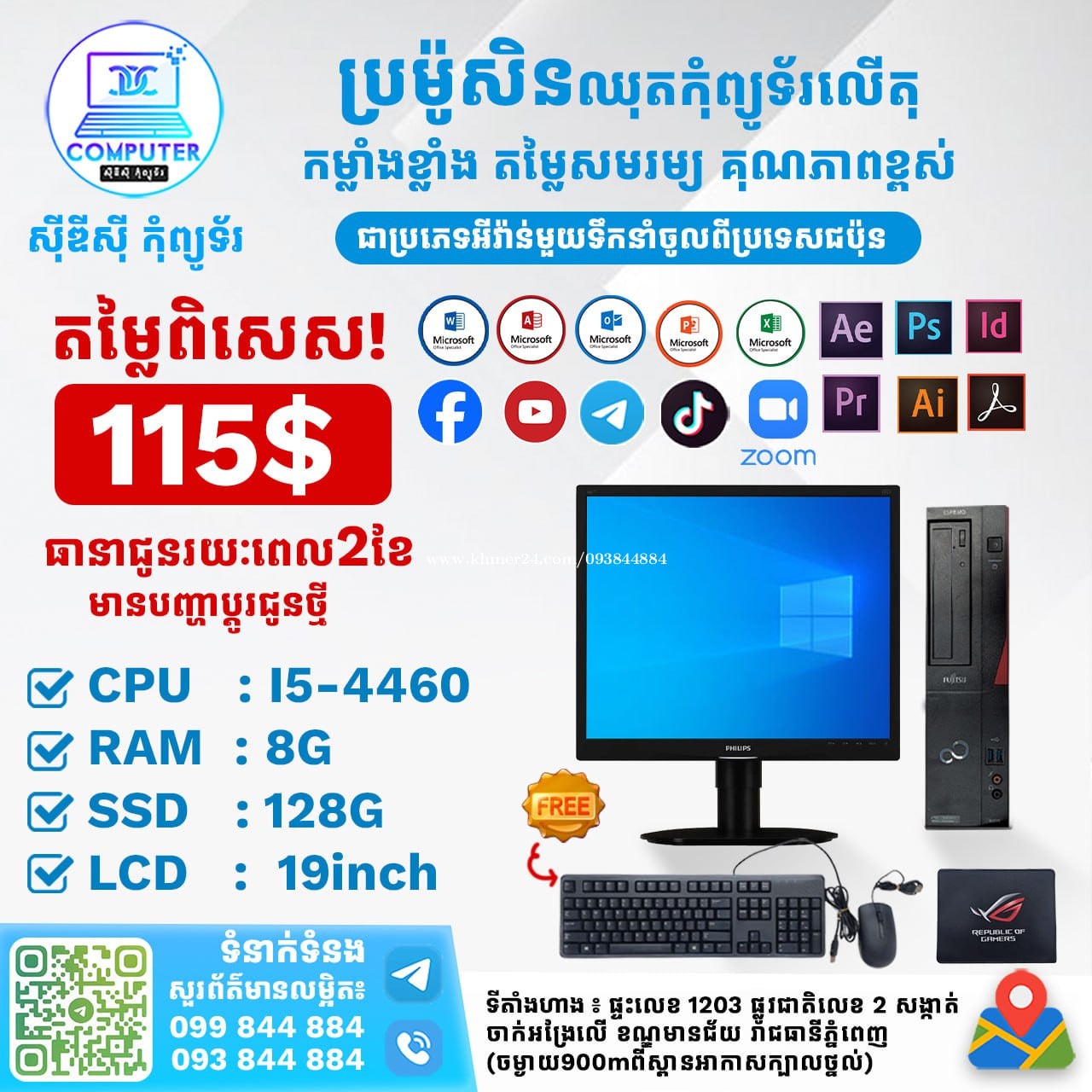 ឈុតកុំព្យូទ័រលើតុ ១ឈុតតម្លៃត្រឹមតែ 115$ CPU I5-4460 RAM 8G SSD 128G LCD 19inch ថែមជូន Mouse Keybaord and Mouse Pad ធានារយះពេល 2ខែ អតិថិជនអាចអញ្ញើញមកមើលផ្ទាល់ដល់ទីតាំងហាងបានទំនិញមានស្រាប់មិនបាច់រង់ចាំយូរ! ☎️ទូរស័ព្ទលេខ : Smart093844xxxClick To Call / Cellcard099844xxxClick To Call 📬Telegram : t.me/CDCCOMPUTER093 🏠ទីតាំងហាង : ផ្ទះលេខ 1203 ផ្លូវជាតិលេខ2 , ចាក់អង្រែលើ , ខ័ណ្ឌមានជ័យ , ភ្នំពេញ ( ចំងាយ 900m ពីស្ពានអាកាសក្បាលថ្នល់ ) 📍 Google map : https://maps.app.goo.gl/R3W9thPP5omgsMaZA