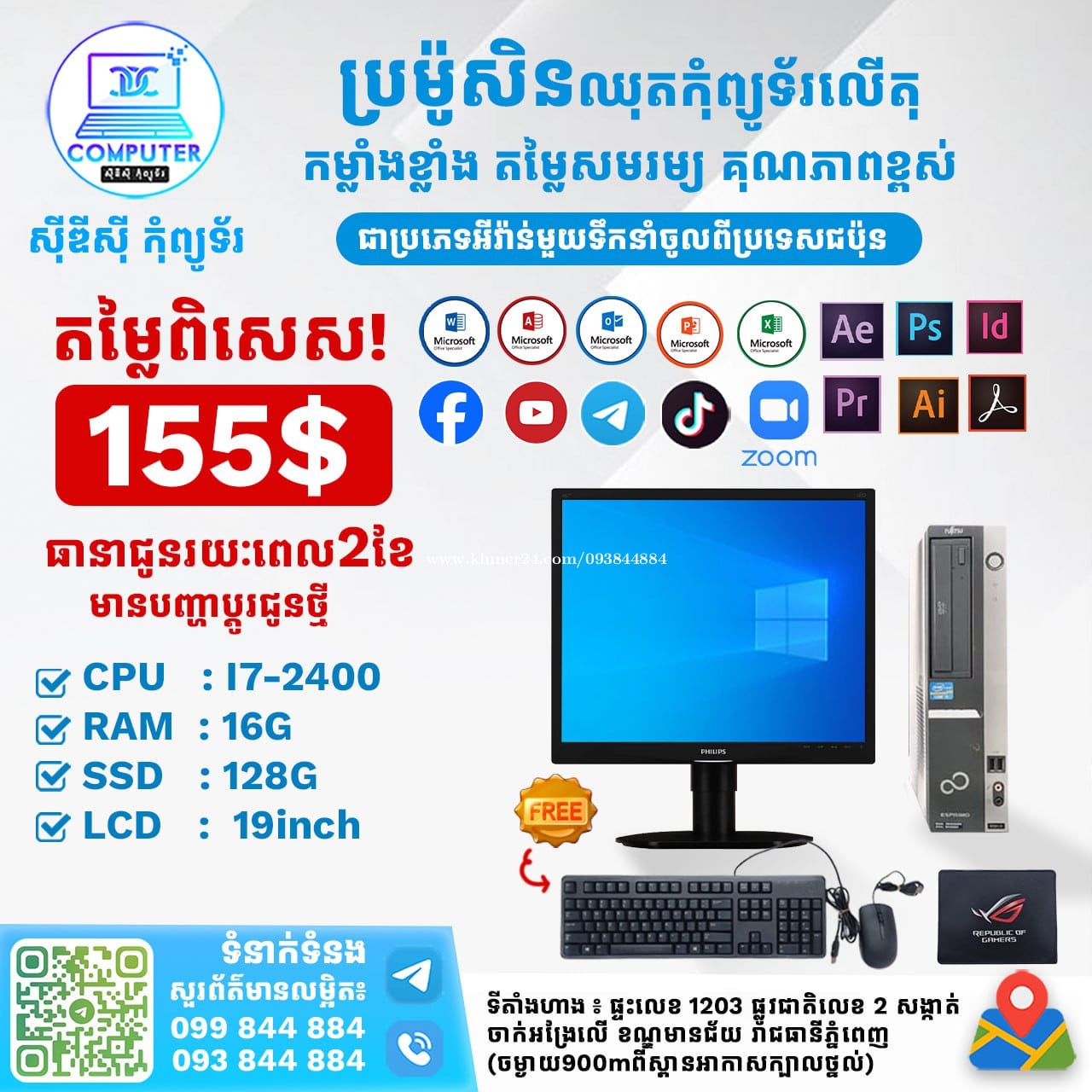 ឈុតកុំព្យូទ័រលើតុ ១ឈុតតម្លៃត្រឹមតែ 155$ CPU I7-2600 RAM 16G SSD 128G LCD 19inch ថែមជូន Mouse Keybaord and Mouse Pad ធានារយះពេល 2ខែ អតិថិជនអាចអញ្ញើញមកមើលផ្ទាល់ដល់ទីតាំងហាងបានទំនិញមានស្រាប់មិនបាច់រង់ចាំយូរ! ☎️ទូរស័ព្ទលេខ : Smart093844xxxClick To Call / Cellcard099844xxxClick To Call 📬Telegram : t.me/CDCCOMPUTER093 🏠ទីតាំងហាង : ផ្ទះលេខ 1203 ផ្លូវជាតិលេខ2 , ចាក់អង្រែលើ , ខ័ណ្ឌមានជ័យ , ភ្នំពេញ ( ចំងាយ 900m ពីស្ពានអាកាសក្បាលថ្នល់ ) 📍 Google map : https://maps.app.goo.gl/R3W9thPP5omgsMaZA
