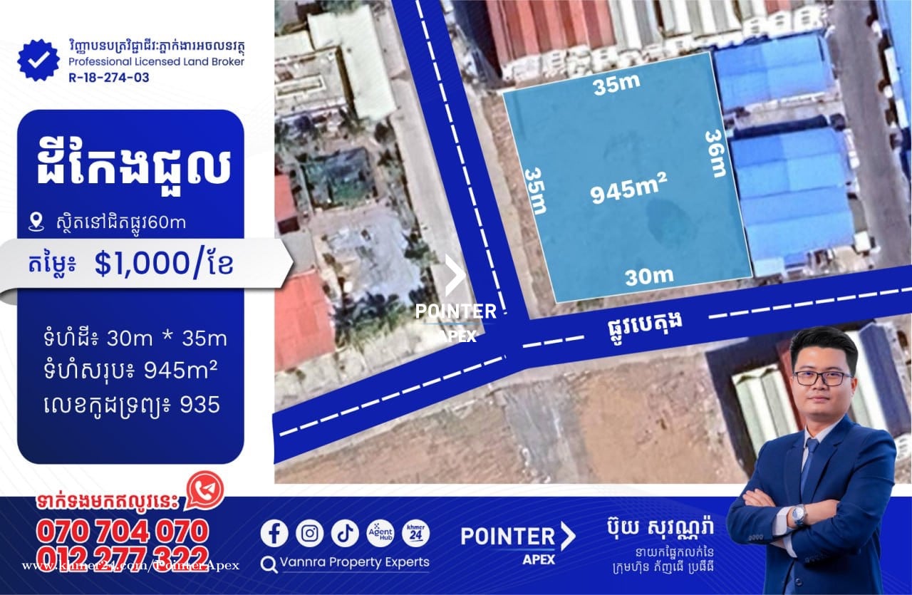 ដីកែងជួល នៅជិតផ្លូវសម្តេចហ៊ុន សែន60m សម្រាប់ជួល:$1,000/ខែ ទំហំដី:30m x 35m ទំហំដីសរុប:945m2 🔐លេខកូដអចលនវត្ថុ៖ 935 📌 ស្ថិតនៅលើផ្លូវបេតុង សង្កាត់ចាក់អង្រែក្រោម ខណ្ឌមានជ័យ ភ្នំពេញ ——————————— ទាក់ទងមកឥលូវនេះ៖ Call: 070704xxxClick To Call / 012277xxxClick To Call Telegram: https://t.me/vannraaa 微信号: vannra-experts - Channel: https://t.me/vannrapropertyexperts - Tiktok: https://www.tiktok.com/@vannra_property_experts - Facebook: https://www.facebook.com/vannra.phnompenh.property/