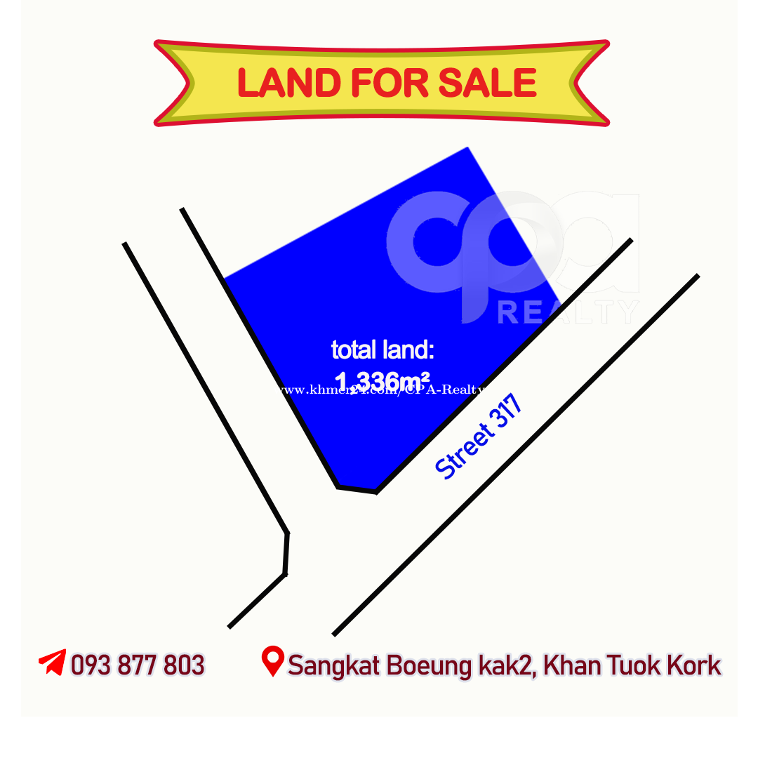⭕️ដីកែងលក់នៅទួលគោក 🆔02997 💢ទំហំដី: 35m x 38m (1,336m2) 💢តម្លៃលក់: $4,100/m2 ចរចារ 📍ទីតាំង៖ សង្កាត់បឹងកក់, ខណ្ឌទួលគោក ☎️ 𝟎𝟗𝟑 𝟖𝟕𝟕 𝟖𝟎𝟑 𝙩𝙚𝙡𝙚𝙜𝙧𝙖𝙢: https://t.me/cparealtors 𝙬𝙚𝙘𝙝𝙖𝙩 𝙄𝘿: 𝘾𝙋𝘼_𝙍𝙚𝙖𝙡𝙩𝙮 𝙩𝙚𝙡𝙚𝙜𝙧𝙖𝙢 𝙘𝙝𝙖𝙣𝙣𝙚𝙡: https://t.me/cparealty