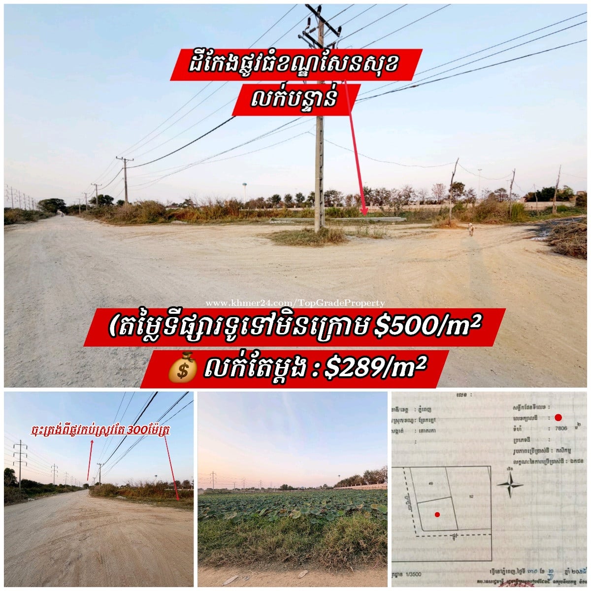 📣 ដីកែងលក់_ប្លុកភូមិគ្រឹះធំៗ_ចុះពីផ្លូវកប់ស្រូវបន្តិច_ខណ្ឌសែនសុខ (តម្លៃទីផ្សារទូទៅមិនក្រោម $500/m² 💰 លក់តែម្តង : $289/m² 👉🏿 ទំហំដី : 99m x 90m (7,806m²) 👉🏿 ផ្លូវរដ្ធមុខដីទទឹង: 40m ផ្លូវចំហៀង20m 📥ព័ត៌មានបន្ថែមសូមធ្វេីកាទំនាក់ទំនងTelagram: https://t.me/Sambo_At • 092262xxxClick To Call • 098827xxxClick To Call • 0712022xxxClick To Call 🌐 ដី/ផ្ទះទីតាំងល្អៗ: https://t.me/topgradeproperty