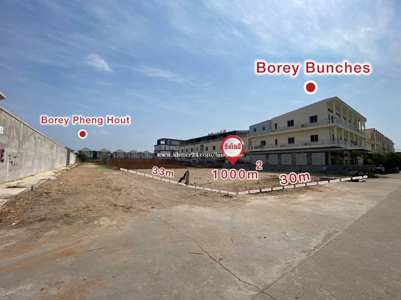 ដីកែង(ផ្លូវបែកជាបួន) ដីសាងសង់វីឡា ឬឃ្លាំង អាគារ ➡️ ទំហំ៖ 33m x 30m ➡️ តម្លៃលក់៖ 700$/ម៉ែត្រការ៉េ ចរចា ➡️ ផ្លូវរដ្ឋ ភ្ជាប់ ចូលក្នុងបុរីភ្នំពេញផាក និងបុរីធំៗជាច្រើន ➡️ ទីតាំងខាងក្រោយបុរីប៉េងហួត6A (សាលាកិសិកម្មព្រែកលៀប) ក្រោយបុរីភ្នំពេញផាក និងក្រោយ ធនាគារអភិវឌ្ឍន៍កសិកម្មនិងជនបទ ធ.អ.ជ.ក ➡️ ចុះពីផ្លូវជាតិ៦A ត្រឹមតែ 400ម៉ែត្រ តែប៉ុណ្ណោះ ! ➡️ ទីតាំងដីនេះស្ថិតនៅលើផ្លូវដែលតភ្ជាប់ពីផ្លូវបេតុងព្រែកតាគង់ ចូលទៅកាន់បុរីភ្នំពេញផាក និងគំរោងបុរីធំៗជាច្រើនទៀត !