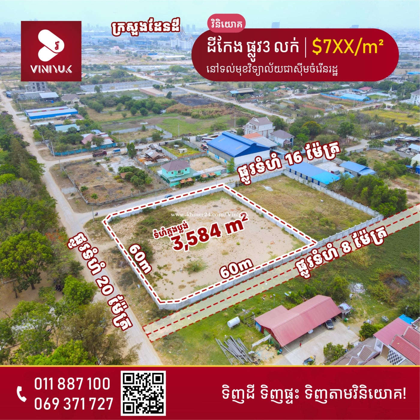 ដីកែង ផ្លូវ 3 លក់បន្ទាន់!! 📍 ទីតាំងដី: នៅភូមិស្វាយប៉ាក សង្កាត់ស្វាយប៉ាក ខណ្ឌឬស្សីកែវ - តម្លៃ: $7XX/m² - ទំហំដី: 60m x 60m (ក្នុងប្លង់ 3,584m²) - ផ្លូវខាងកើតដី 20m ផ្លូវខាងជើង 8m ផ្លូវខាងត្បូង 16m - ប្លង់រឹង L-Map - លេខអាជ្ញាប័ណ្ណ : E-22-404