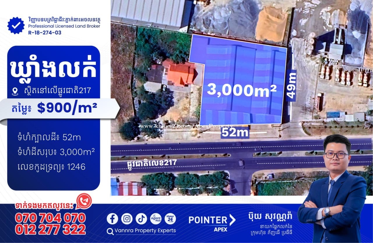 ដីឃ្លាំងលក់ស្ថិតនៅលើផ្លូវ217 សម្រាប់លក់:$900/ m² ឬ 2,700,000 ទំហំដី: 52m x 49m ទំហំដីសរុបៈ 3,000m² 🔐លេខកូដអចលនវត្ថុ៖ 1246 ស្ថិតនៅលើផ្លូវលេខ217សង្កាត់ជើងឯក ខណ្ឌដង្កោ ភ្នំពេញ ——————————— ទាក់ទងមកឥលូវនេះ៖ Call: 070704xxxClick To Call / 012277xxxClick To Call Telegram: https://t.me/vannraaa 微信号: vannra-experts - Channel: https://t.me/vannrapropertyexperts - Tiktok: https://www.tiktok.com/@vannra_property_experts - Facebook: https://www.facebook.com/vannra.phnompenh.property/