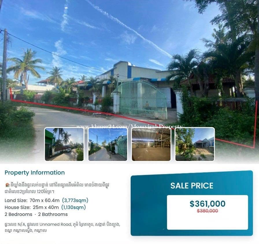 ដីឃ្លាំងលក់ប្រញ៉ាប់ ៖ ស្រុកកណ្តាលស្ទឹង លក់បញ្ជុះតម្លៃ | Price: $380,000 👉មកត្រឹមតែ $361,000 ប៉ុណ្ណោះ ☑️ទំហំដី | Land Size: 70m x 60.4m= 3,773m² ☑️ទំហំឃ្លាំង | Warehouse Size: 25m x 40m = 1,009m² ☑️ទំហំផ្ទះ | Detached House Size: 11m x 11m = 121m² ☑️ជាន់ | Floors: 1 ☑️បន្ទប់ដេក | Bedroom: 2 ☑️បន្ទប់ទឹក | Bathroom: 2 ☑️ប្រភេទប្លង់រឹង | Title Deed type: Hard Title ☑️ទិសត្បូង | Direction: South ☑️ទំហំផ្លូវ | Access road size: 5m អាស័យដ្ធាន ៖ ភូមិព្រៃតាតូច, ឃុំបឹងខ្យាង, ស្រុកកណ្តាលស្ទឹង, ខេត្តកណ្តាល។ Address ៖ Prey Ta Touch Village, Boeng Khyang, Kandal Stueng, Kandal. 💰លោកអ្នកអាចទទួលកម្ចីពីធនាគារជាមួយនឹងលក្ខខណ្ឌយ៉ាងពិសេស អាស្រ័យលើការសិក្សាកម្ចី។ 📲 078990xxxClick To Call | 015990xxxClick To Call 📨 Telegram : http://t.me/Soriya2001 📩 Urgent Property : https://t.me/panhchsak001 (ទីតាំងផ្សេងទៀតលក់បន្ទាន់)