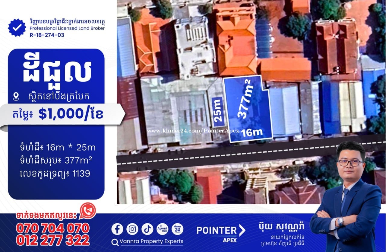 ដីជួលនៅបឹងត្របែក សម្រាប់ជួល: $1,000/ខែ ទំហំដី: 16m x 25m ទំហំដីសរុប: 377m² 🔐លេខកូដអចលនវត្ថុ៖ 1139 ស្ថិតនៅលើផ្លូវលេខ 99 សង្កាត់បឹងត្របែក ខណ្ឌចំការមន ភ្នំពេញ ——————————— ទាក់ទងមកឥលូវនេះ៖ Call: 070704xxxClick To Call / 012277xxxClick To Call Telegram: https://t.me/vannraaa 微信号: vannra-experts - Channel: https://t.me/vannrapropertyexperts - Tiktok: https://www.tiktok.com/@vannra_property_experts - Facebook: https://www.facebook.com/vannra.phnompenh.property/