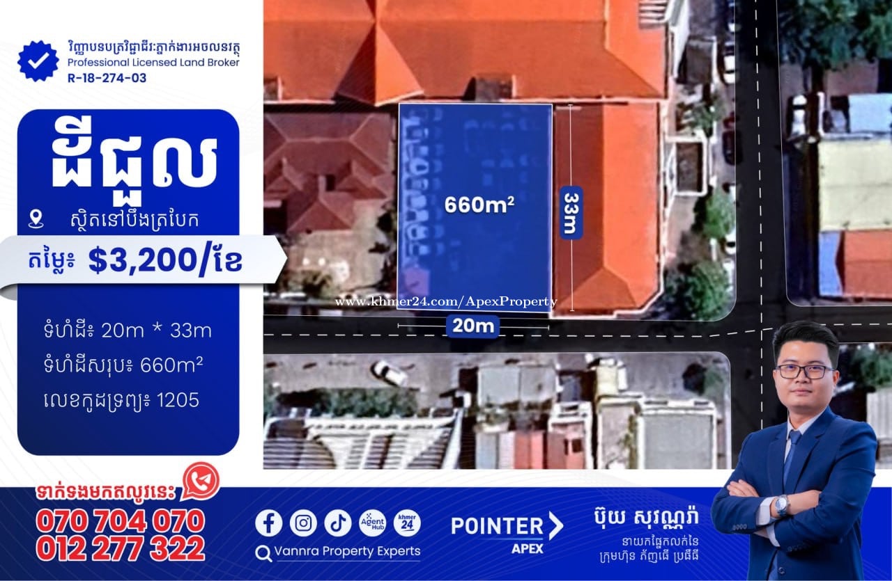 ដីជួលនៅបឹងត្របែក សម្រាប់ជួល:$3,200 ទំហំដី: 20m x 33m ទំហំដីសរុប: 660m² 🔐លេខកូដអចលនវត្ថុ៖ 1205 ស្ថិតនៅលើផ្លូវលេខ95 សង្កាត់បឹងត្របែក ខណ្ឌចំការមន ភ្នំពេញ ——————————— ទាក់ទងមកឥលូវនេះ៖ Call: 070704xxxClick To Call / 012277xxxClick To Call Telegram: https://t.me/vannraaa 微信号: vannra-experts - Channel: https://t.me/vannrapropertyexperts - Tiktok: https://www.tiktok.com/@vannra_property_experts - Facebook: https://www.facebook.com/vannra.phnompenh.property/