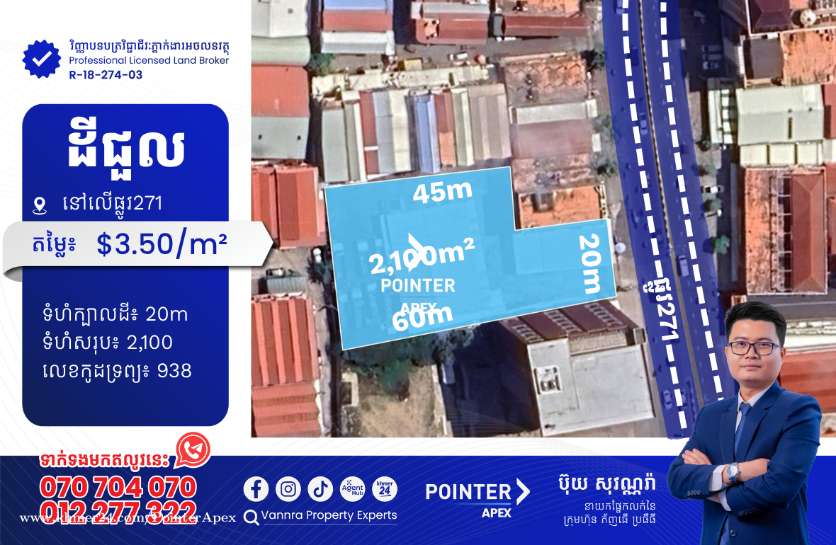 ដីជួលនៅលើផ្លូវ271 សម្រាប់ជួល:$3.50/m2 ទំហំក្បាលដី:20m ទំហំដីសរុប:2,100m2 🔐លេខកូដអចលនវត្ថុ៖ 938 📌 ស្ថិតនៅលើផ្លូវ271 សង្កាត់ទឹកថ្លា ខណ្ឌសែន សុខ ភ្នំពេញ ——————————— ទាក់ទងមកឥលូវនេះ៖ Call: 070704xxxClick To Call / 012277xxxClick To Call Telegram: https://t.me/vannraaa 微信号: vannra-experts - Channel: https://t.me/vannrapropertyexperts - Tiktok: https://www.tiktok.com/@vannra_property_experts - Facebook: https://www.facebook.com/vannra.phnompenh.property/
