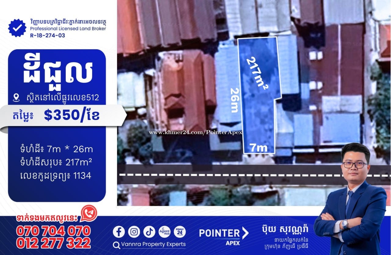 ដីជួលនៅលើផ្លូវលេខ512 សម្រាប់ជួល: $350 ទំហំដី: 7m x 26m ទំហំដីសរុប: 217m² 🔐លេខកូដអចលនវត្ថុ៖ 1134 ស្ថិតនៅលើផ្លូវលេខ512 សង្កាត់ផ្សារដើមថ្កូវ ខណ្ឌចំការមន ភ្នំពេញ ——————————— ទាក់ទងមកឥលូវនេះ៖ Call: 070704xxxClick To Call / 012277xxxClick To Call Telegram: https://t.me/vannraaa 微信号: vannra-experts - Channel: https://t.me/vannrapropertyexperts - Tiktok: https://www.tiktok.com/@vannra_property_experts - Facebook: https://www.facebook.com/vannra.phnompenh.property/