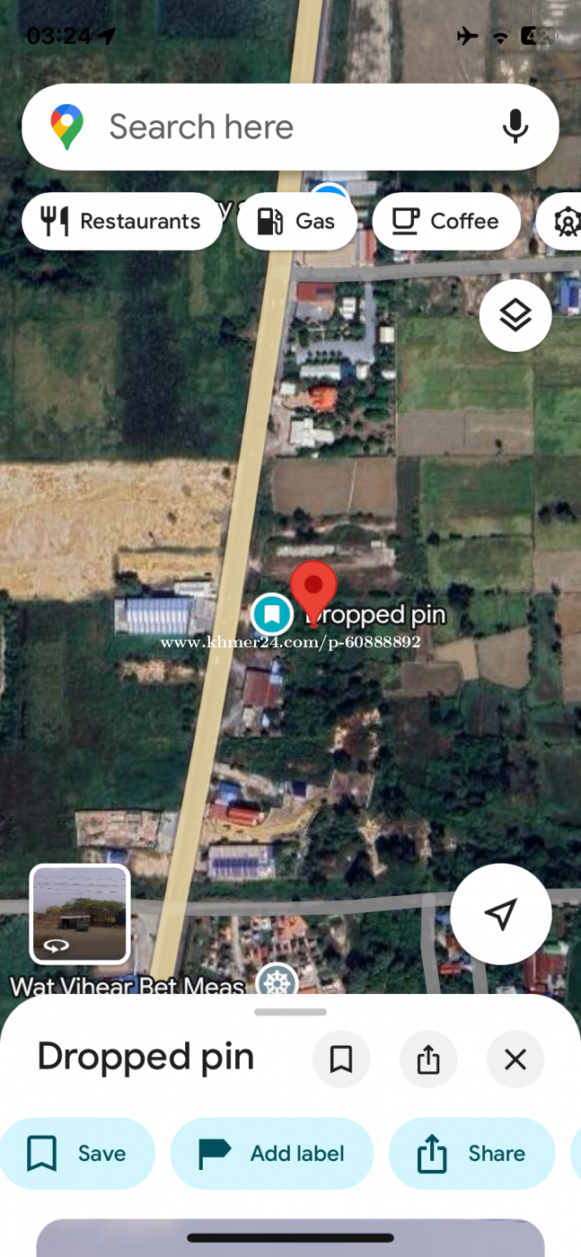 ដីលក់ជាប់ផ្លូវជាតិលេខ 2. ចំងាយ 7km ពីរង្វង់មូលគួរស្រូវ. 15km ពីព្រលានយន្តហោះតេជោ ថ្មី! Land for sale next to National Road No. 2. 7km from the Korsov roundabout. 15km from the new Techo Thmey Airport. 位于2号国道旁的土地出售。距科尔索夫环岛7公里,距新建的特乔·特梅机场15公里. Location https://maps.app.goo.gl/uWttrLPkCXbgWE9Z8?g_st=ipc Contact 060888xxxClick To Call Telegram
