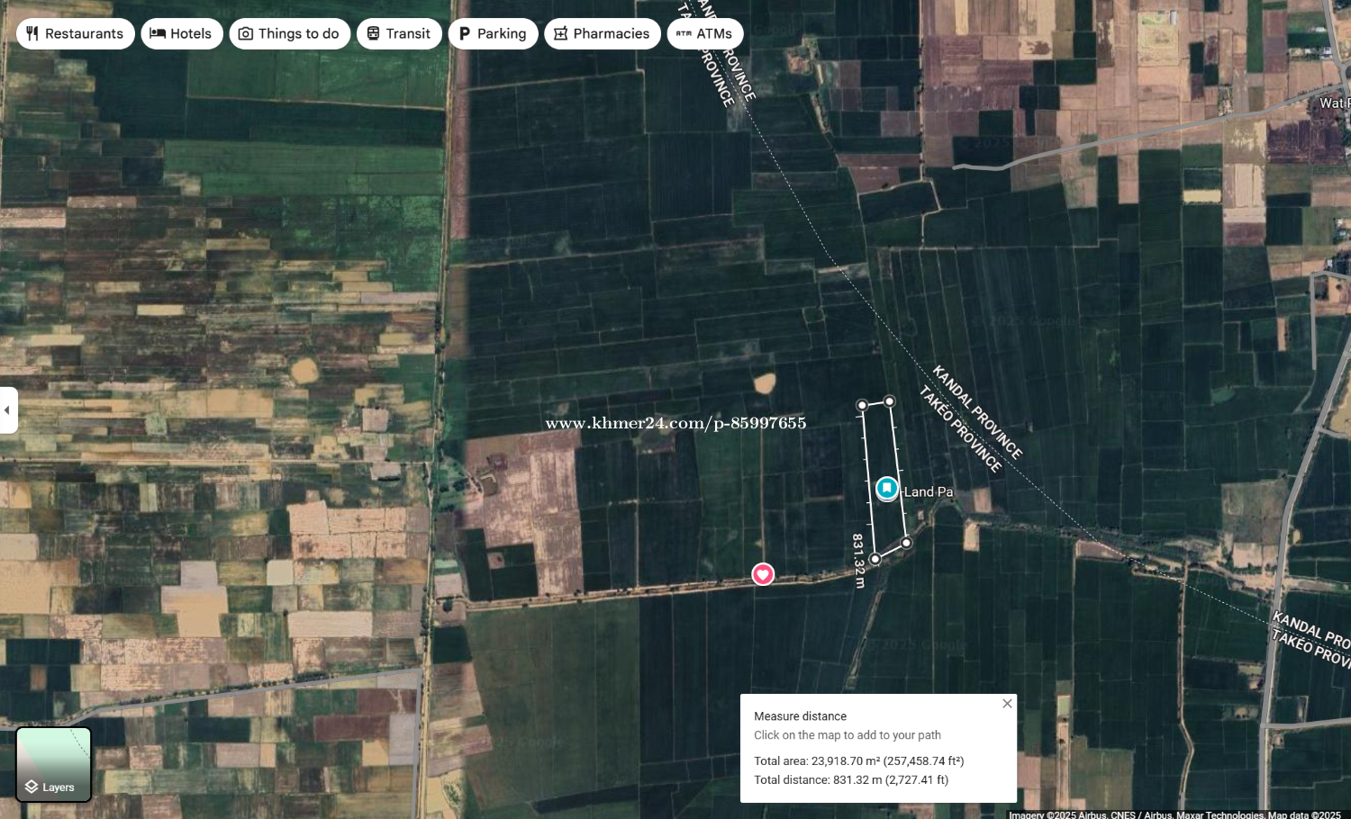 ដីលក់ជាប់ផ្លូវប្រឡាយ២០ម៉ែត្រ នៅខាងត្បូងប្រលានយន្តហោះមរតកតេជោ ចម្ងាយ៨គីឡូម៉ែត្រ ក្បែរគម្រោងរោងចក្រ១០០ហិចតា ដីស្ថិតនៅ ភូមិដូង ឃុំដូង ស្រុកបាទី ខេត្តតាកែវ ដីទំហំ: 80x295 ស្មើ 23605ម៉ែត្រការ៉េ កម្មសិទ្ធិ ប្លង់រឹង រត់ការផ្ទេរឈ្មោះជូនមួយចប់ តម្លៃ: 14ដុល្លា/1ម៉ែត្រការ៉េ ចរចារជាមួយម្ចាស់ផ្ទាល់ បងបងជួយរកភ្ញៀវ គិត Commission ជូន 3% Tel : 085997xxxClick To Call Location: https://maps.app.goo.gl/3LyEbxYoJBT89sFK7?g_st=ac