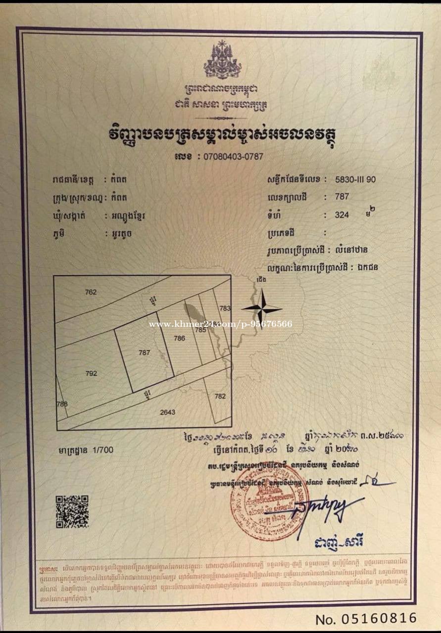 ដីក្រុងកំពត 324m2 ផ្លូវមុខដី 8m ចូលច្រកអូតែលរ៉េនហ្វរែស ផ្លូវទឹកឈូ កៀនសាលារាជសម្ភារ។ អាចសង់ជាកូនផ្ទះលម្ហែរជួលប្រចាំថ្ងៃបាន កែច្នៃជាចំណូលបាន ឬទុកលក់ចំណេញពេលខាងមុខ។ ផ្ទេរប្លង់រឹង បង់ពន្ធជូន ឬវ៉ៃដូរជាឡាន