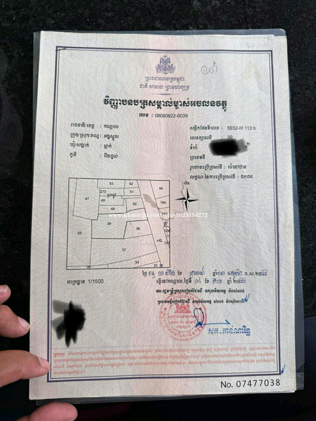 ដីលក់បន្ទាន់ក្រោមទីផ្សារ 60,000 ចរចាក្បាលដី 15 មានប្លង់រឹងចាក់ដីហើយស្អាតធ្វើរបងហើយស្អាត។សាក សមនឹងធ្វើអាជីវកម្មឬឃ្លាំងធំៗ។.កណ្តាល អង្គស្នួល