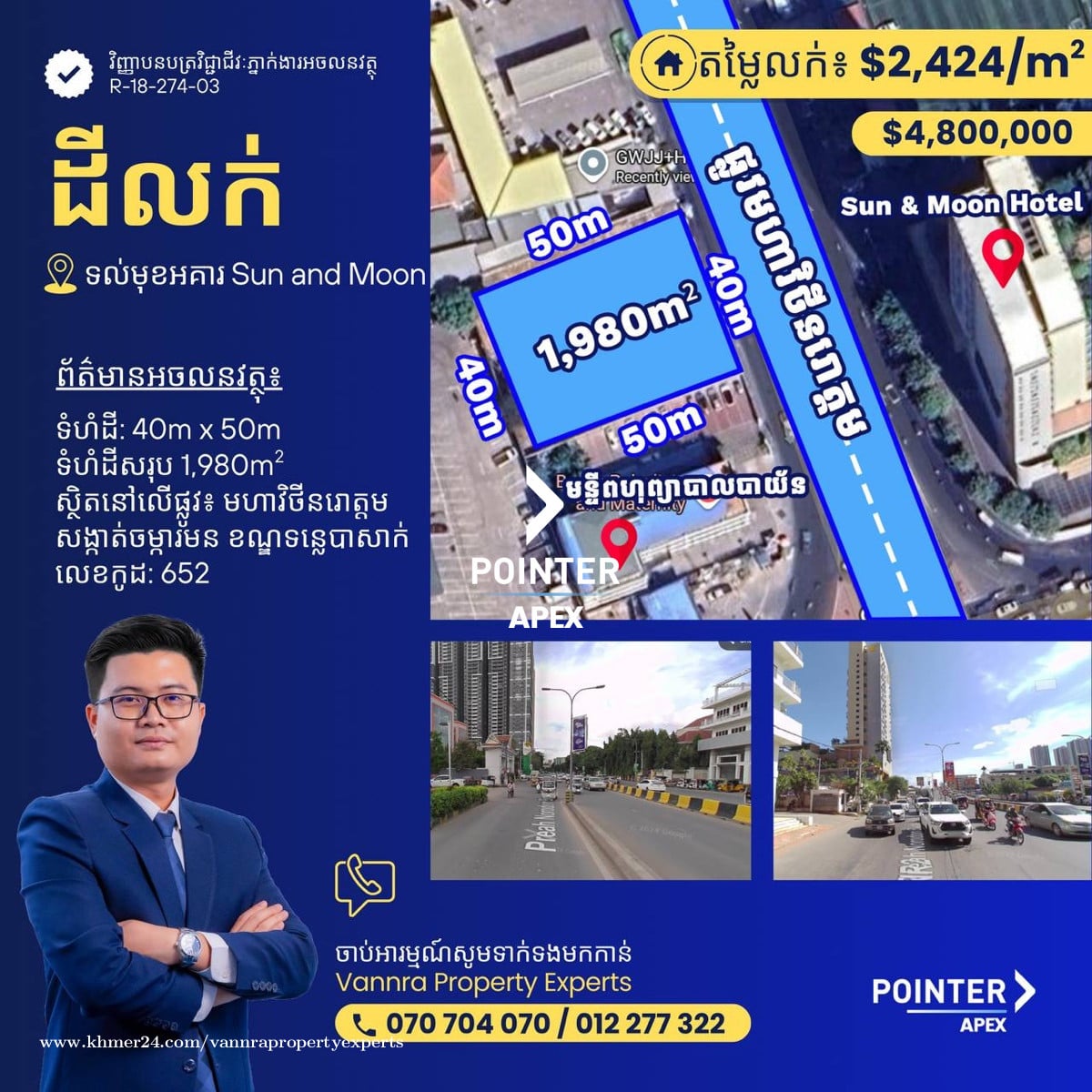 ដីសម្រាប់លក់នៅទល់មុខ អូតែល Sun & Moon 🤩 សម្រាប់លក់| $4,800,000 ទំហំដី: 40mx 50m 🔐លេខកូដអចលនវត្ថុ៖ 652 📌 លើផ្លូវមហាវិថីនរោត្តម សង្កាត់ចម្ការមន ខណ្ឌទន្លេបាសាក់ ភ្នំពេញ ——————————— ទាក់ទងមកឥលូវនេះ៖ Call: 070704xxxClick To Call / 012277xxxClick To Call Telegram: https://t.me/vannraaa 微信号: vannra-experts - Channel: https://t.me/vannrapropertyexperts - Tiktok: https://www.tiktok.com/@vannra_property_experts - Facebook: https://www.facebook.com/vannra.phnompenh.property/