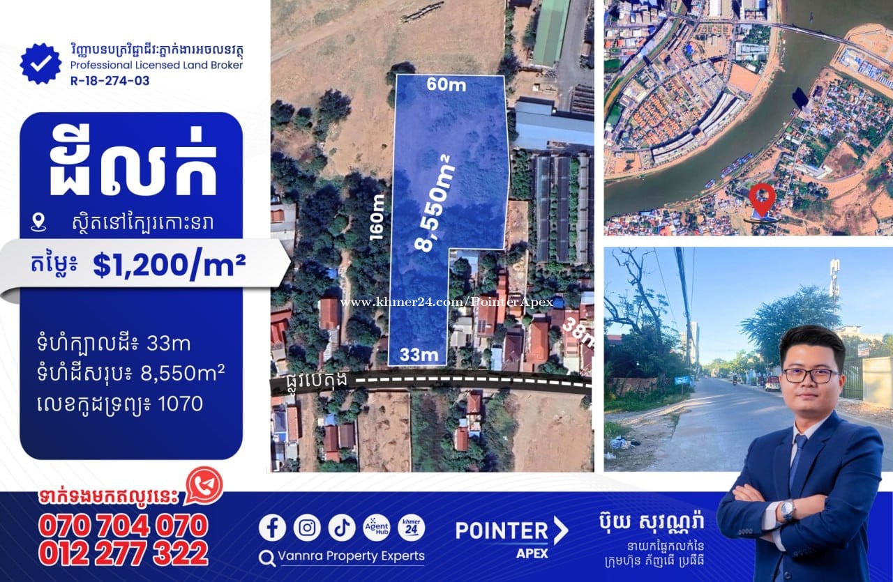 ដីលក់នៅជិតកោះនរា សម្រាប់លក់: $1,200/m² ឬ$10,260,000 ទំហំក្បាលដី: 33m ទំហំដីសរុប: 8,550m,² 🔐លេខកូដអចលនវត្ថុ៖ 1070 ស្ថិតនៅលើផ្លូវបេតុង សង្កាត់និរោធ ខណ្ឌច្បារអំពៅ ភ្នំពេញ ——————————— ទាក់ទងមកឥលូវនេះ៖ Call: 070704xxxClick To Call / 012277xxxClick To Call Telegram: https://t.me/vannraaa 微信号: vannra-experts - Channel: https://t.me/vannrapropertyexperts - Tiktok: https://www.tiktok.com/@vannra_property_experts - Facebook: https://www.facebook.com/vannra.phnompenh.property/