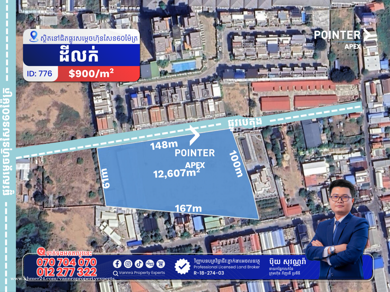 ដីលក់នៅជិតផ្លូវសម្តេច ហ៊ុន សែន 60ម៉ែត្រ សម្រាប់លក់:$11,346,300 ទំហំដី: 148m (12,607m2) 🔐លេខកូដអចលនវត្ថុ៖ 776 📌 ស្ថិតលើផ្លូវបេតុង សង្កាត់ចាក់អង្រែក្រោម ខណ្ឌមានជ័យ ភ្នំពេញ ——————————— ទាក់ទងមកឥលូវនេះ៖ Call: 070704xxxClick To Call / 012277xxxClick To Call Telegram: https://t.me/vannraaa 微信号: vannra-experts - Channel: https://t.me/vannrapropertyexperts - Tiktok: https://www.tiktok.com/@vannra_property_experts - Facebook: https://www.facebook.com/vannra.phnompenh.property/