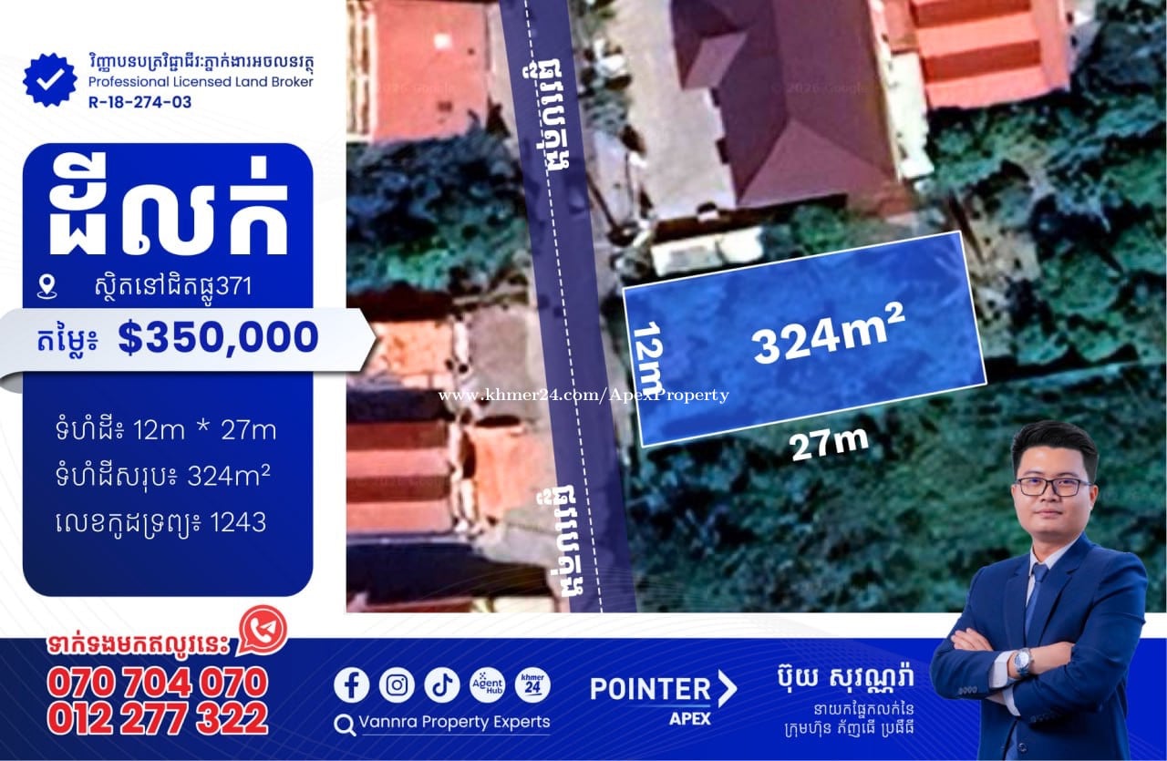 ដីលក់ស្ថិតនៅជិតផ្លូវ371 សម្រាប់លក់:$1,080/ m² ឬ $350,000 ទំហំដី: 12m x 27m ទំហំដីសរុបៈ 324m² 🔐លេខកូដអចលនវត្ថុ៖ 1243 ស្ថិតនៅលើផ្លូវបេតុង សង្កាត់បឹងទំពុន ខណ្ឌមានជ័យ ភ្នំពេញ ——————————— ទាក់ទងមកឥលូវនេះ៖ Call: 070704xxxClick To Call / 012277xxxClick To Call Telegram: https://t.me/vannraaa 微信号: vannra-experts - Channel: https://t.me/vannrapropertyexperts - Tiktok: https://www.tiktok.com/@vannra_property_experts - Facebook: https://www.facebook.com/vannra.phnompenh.property/