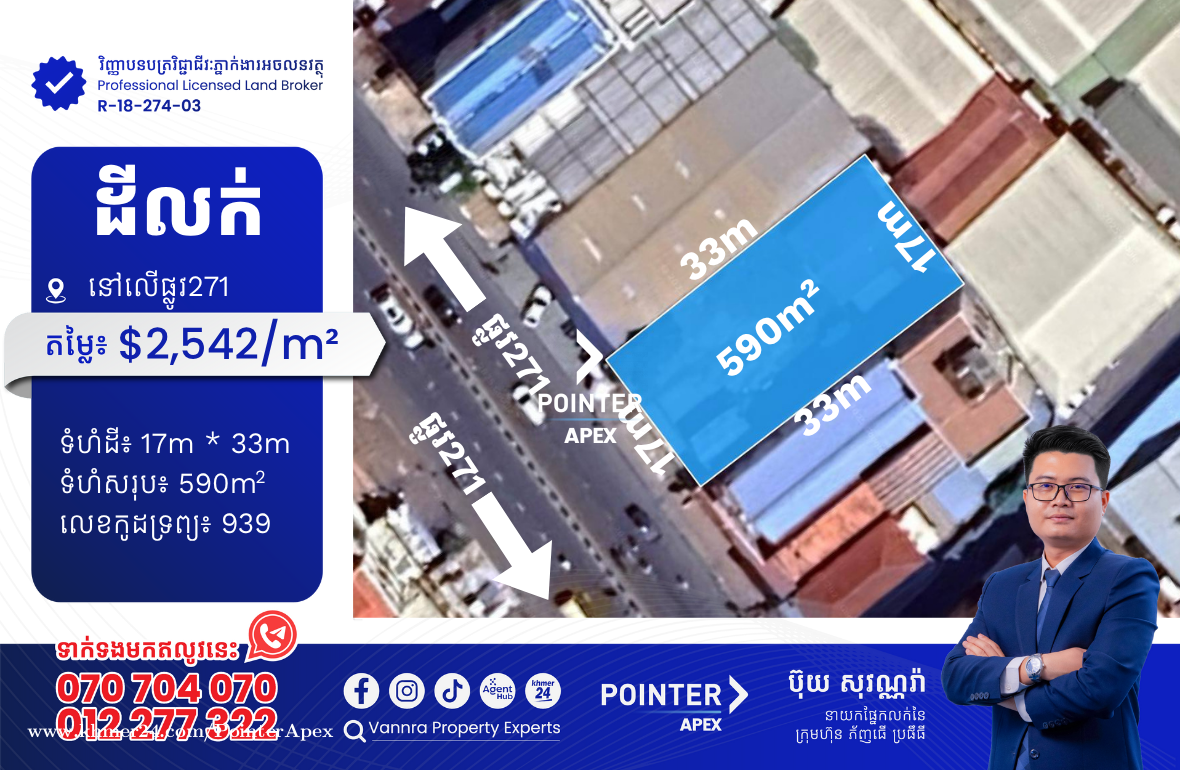 ដីលក់នៅលើផ្លូវ271 ជិតស្ពានអាកាសស្ទឹងមានជ័យ សម្រាប់លក់:$2,542/m2 ទំហំដី:17m x 33m ទំហំដីសរុប:590m2 🔐លេខកូដអចលនវត្ថុ៖ 939 📌 ស្ថិតនៅលើផ្លូវ271 សង្កាត់បឹងសាឡាង ខណ្ឌទួលគោក ភ្នំពេញ ——————————— ទាក់ទងមកឥលូវនេះ៖ Call: 070704xxxClick To Call / 012277xxxClick To Call Telegram: https://t.me/vannraaa 微信号: vannra-experts - Channel: https://t.me/vannrapropertyexperts - Tiktok: https://www.tiktok.com/@vannra_property_experts - Facebook: https://www.facebook.com/vannra.phnompenh.property/