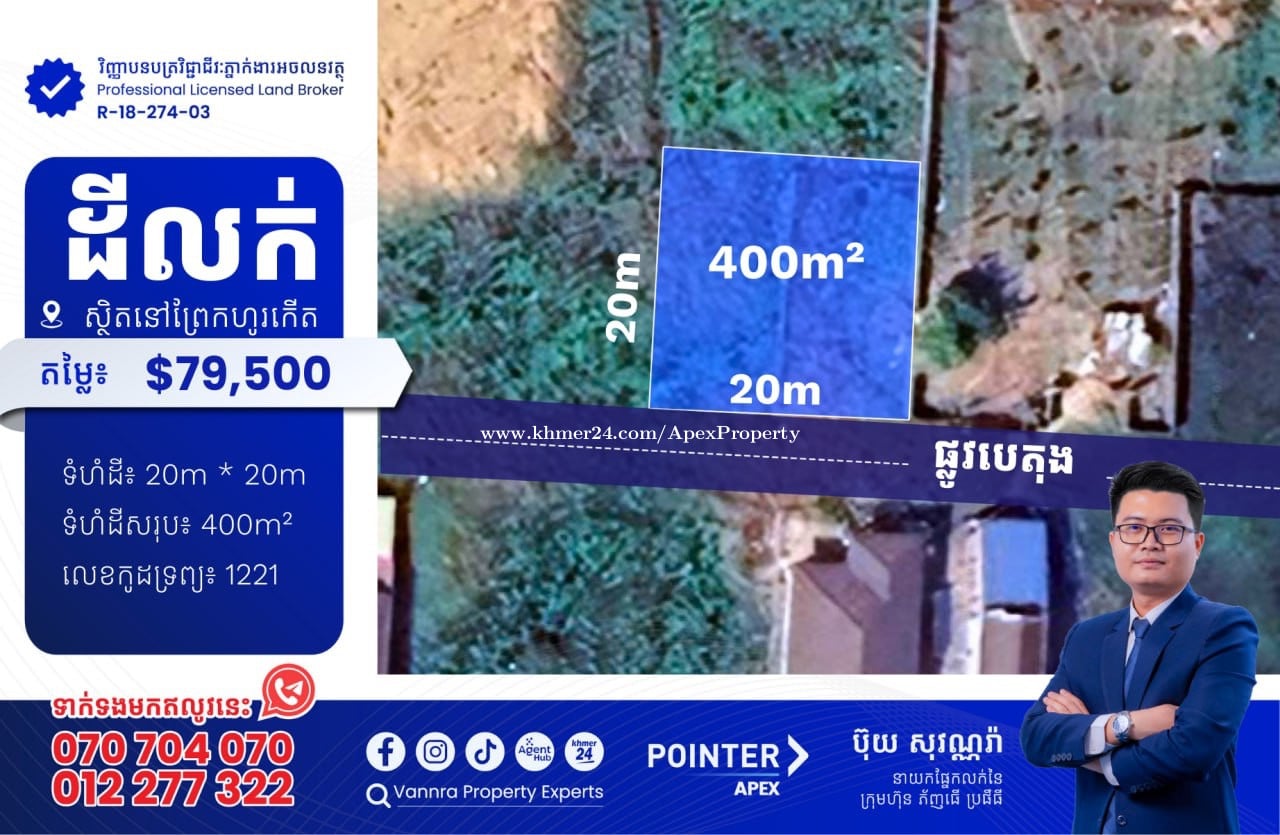 ដីលក់នៅព្រែកហូរកើត សម្រាប់លក់:$79,500 ទំហំដី: 20mx 20m ទំហំដីសរុប: 400m² 🔐លេខកូដអចលនវត្ថុ៖ 1221 ស្ថិតនៅព្រែកហូរកើត សង្កាត់ព្រែកហូរ ក្រុងតាខ្មៅ ——————————— ទាក់ទងមកឥលូវនេះ៖ Call: 070704xxxClick To Call / 012277xxxClick To Call Telegram: https://t.me/vannraaa 微信号: vannra-experts - Channel: https://t.me/vannrapropertyexperts - Tiktok: https://www.tiktok.com/@vannra_property_experts - Facebook: https://www.facebook.com/vannra.phnompenh.property/