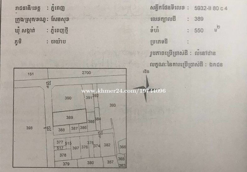 ដីលក់នៅខាងមុខបុរីជីបម៉ុង ដីម្ចាស់ផ្ទាល់ នៅខាងកើតផ្សារជីបម៉ុងម៉ូល ផ្លូវម៉ុងរិទ្ធី ទិសដី បែរខាងលិច ក្បាលដី 15m បណ្តោយដី 37m លក់សរុប $550,000 ចរចា ទំហំ 550m2 ប្លង់រឹង 012700xxxClick To Call