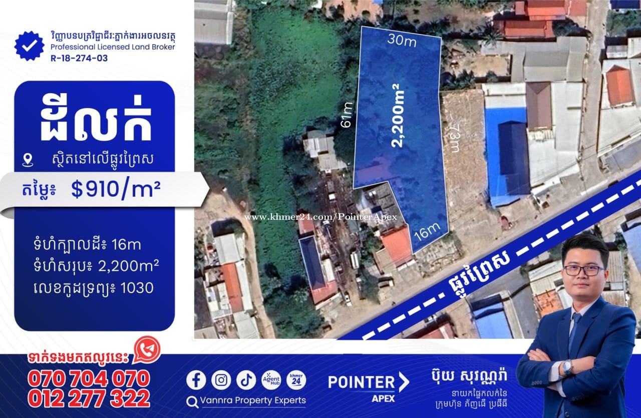 ដីលក់នៅលើផ្លូវព្រៃស សម្រាប់លក់: $910m² ឬ $2,000,000 ទំហំក្បាលដី:16m ទំហំដីសរុប: 2,200m² 🔐លេខកូដអចលនវត្ថុ៖ 1030 ស្ថិតនៅលើផ្លូវព្រៃស សង្កាត់ព្រៃស ខណ្ឌដង្កោ ភ្នំពេញ ——————————— ទាក់ទងមកឥលូវនេះ៖ Call: 070704xxxClick To Call / 012277xxxClick To Call Telegram: https://t.me/vannraaa 微信号: vannra-experts - Channel: https://t.me/vannrapropertyexperts - Tiktok: https://www.tiktok.com/@vannra_property_experts - Facebook: https://www.facebook.com/vannra.phnompenh.property/