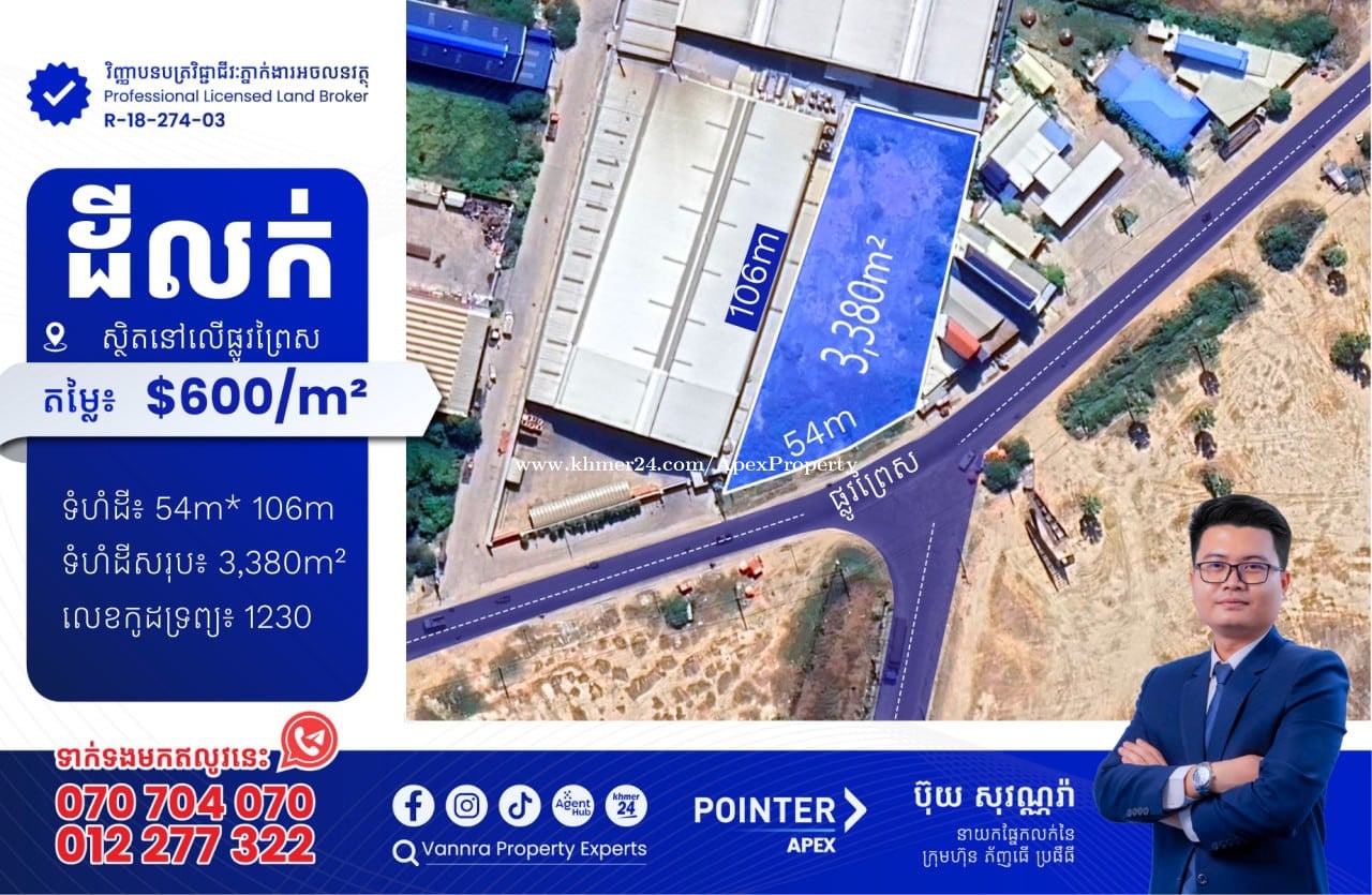 ដីលក់ស្ថិតនៅលើផ្លូវព្រៃស សម្រាប់លក់:$600/m² ឬ $ 2,028,000ចរចា ទំហំដី : 54m x 106m ទំហំដីសរុបៈ 3,380m² 🔐លេខកូដអចលនវត្ថុ៖ 1230 ស្ថិតនៅលើផ្លូវព្រៃស សង្កាត់ព្រៃស ខណ្ឌដង្កោ ភ្នំពេញ ——————————— ទាក់ទងមកឥលូវនេះ៖ Call: 070704xxxClick To Call / 012277xxxClick To Call Telegram: https://t.me/vannraaa 微信号: vannra-experts - Channel: https://t.me/vannrapropertyexperts - Tiktok: https://www.tiktok.com/@vannra_property_experts - Facebook: https://www.facebook.com/vannra.phnompenh.property/