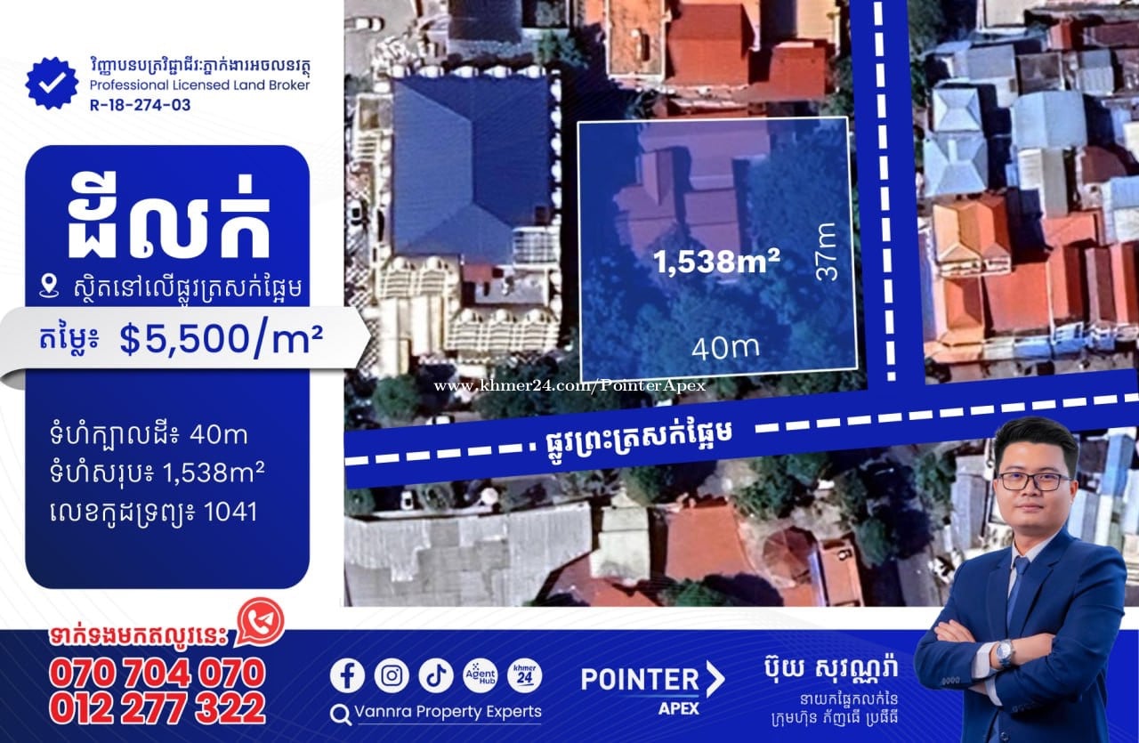 ដីលក់នៅលើផ្លូវព្រះត្រសក់ផ្អែម សម្រាប់លក់: $5,500/m² ឬ $8,459,000 ទំហំក្បាលដី: 40m ទំហំដីសរុប: 1,538m² 🔐លេខកូដអចលនវត្ថុ៖ 1041 ស្ថិតនៅលើផ្លូវព្រះត្រសក់ផ្អែម សង្កាត់បឹងកេងកង1 ខណ្ឌបឹងកេងកង ភ្នំពេញ ——————————— ទាក់ទងមកឥលូវនេះ៖ Call: 070704xxxClick To Call / 012277xxxClick To Call Telegram: https://t.me/vannraaa 微信号: vannra-experts - Channel: https://t.me/vannrapropertyexperts - Tiktok: https://www.tiktok.com/@vannra_property_experts - Facebook: https://www.facebook.com/vannra.phnompenh.property/