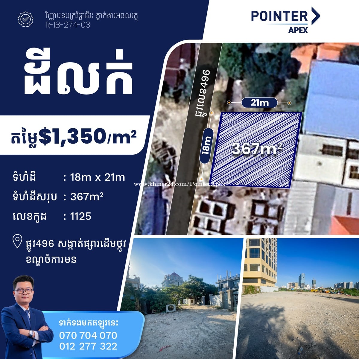 ដីលក់នៅលើផ្លូវ496 សម្រាប់លក់:1,350/m² ឬ $495,450 ទំហំដី: 18m x 21m ទំហំដីសរុប: 367m² 🔐លេខកូដអចលនវត្ថុ៖ 1125 ស្ថិតនៅផ្លូវលេខ496 សង្កាត់ផ្សារដើមថ្កូវ ខណ្ឌចំការមន ភ្នំពេញ ——————————— ទាក់ទងមកឥលូវនេះ៖ Call: 070704xxxClick To Call / 012277xxxClick To Call Telegram: https://t.me/vannraaa 微信号: vannra-experts - Channel: https://t.me/vannrapropertyexperts - Tiktok: https://www.tiktok.com/@vannra_property_experts - Facebook: https://www.facebook.com/vannra.phnompenh.property/