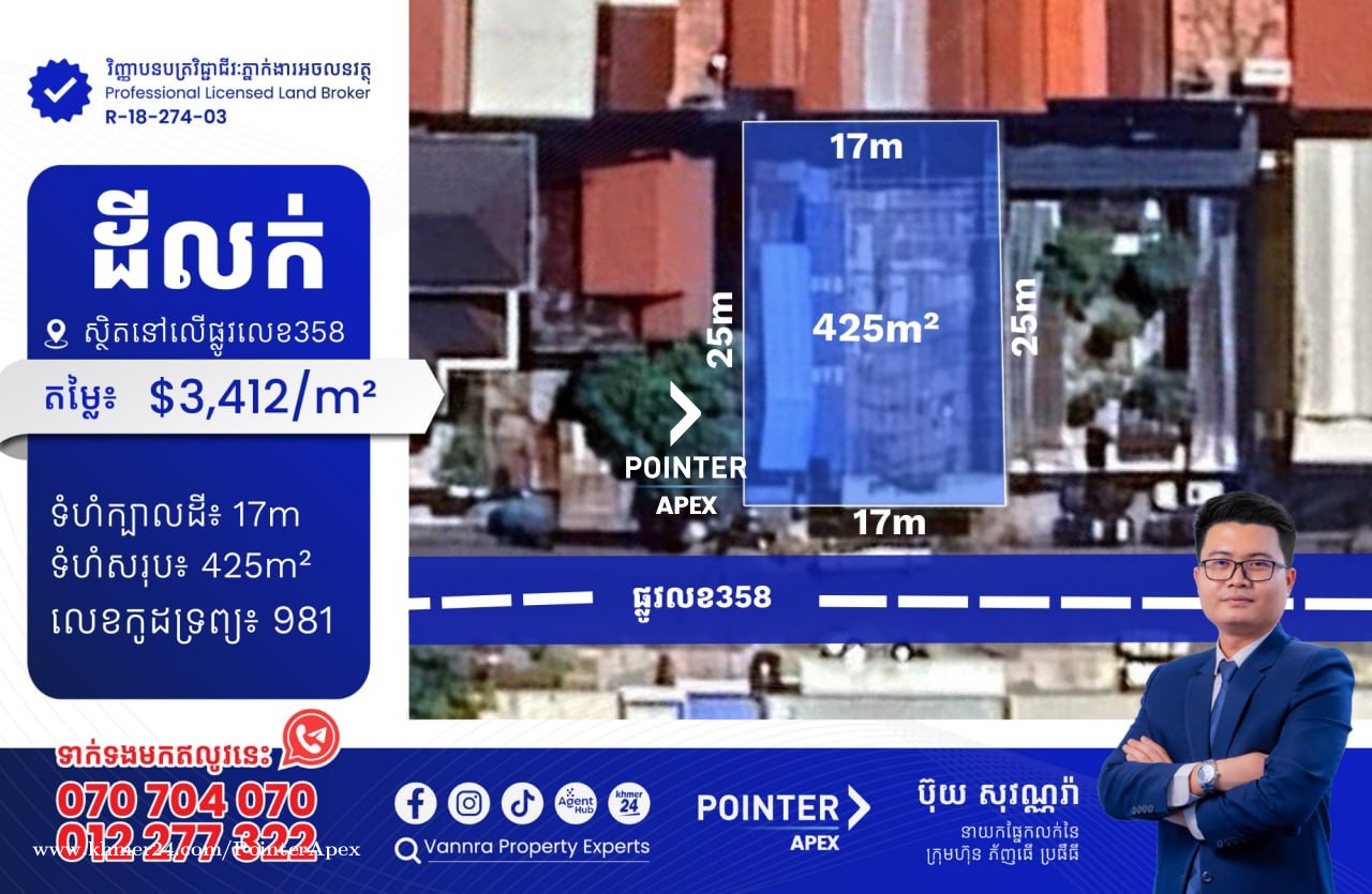 ដីលក់នៅលើផ្លូវ358 សម្រាប់លក់: $3,413/m² ឬ $1,450,000 ទំហំដី:17m x 25m ទំហំដីសរុប:425m² 🔐លេខកូដអចលនវត្ថុ៖ 981 ស្ថិតនៅលើផ្លូវលេខ358សង្កាត់ទួលស្វាយព្រៃទី1 ខណ្ឌបឹងកេងកង ភ្នំពេញ ——————————— ទាក់ទងមកឥលូវនេះ៖ Call: 070704xxxClick To Call / 012277xxxClick To Call Telegram: https://t.me/vannraaa 微信号: vannra-experts - Channel: https://t.me/vannrapropertyexperts - Tiktok: https://www.tiktok.com/@vannra_property_experts - Facebook: https://www.facebook.com/vannra.phnompenh.property/