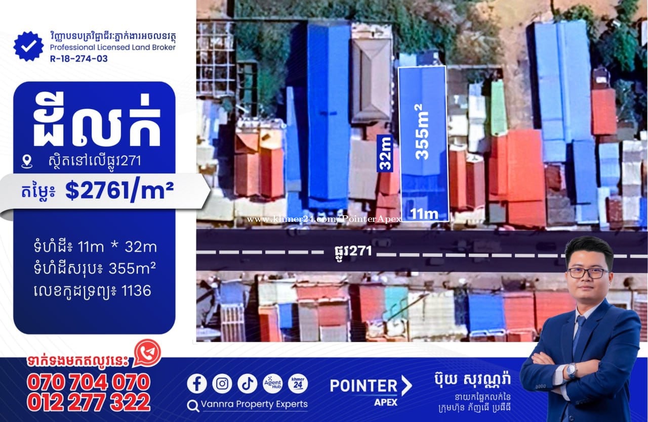 ដីលក់នៅលេីផ្លូវលេខ371 សម្រាប់លក់: $2,761/m² ឬ $980,000 ទំហំដី: 11m x 32m ទំហំដីសរុប: 355m² 🔐លេខកូដអចលនវត្ថុ៖ 1136 ស្ថិតនៅលើផ្លូវលេខ 371 សង្កាត់ចាក់អង្រែលេី ខណ្ឌមានជ័យ ភ្នំពេញ ——————————— ទាក់ទងមកឥលូវនេះ៖ Call: 070704xxxClick To Call / 012277xxxClick To Call Telegram: https://t.me/vannraaa 微信号: vannra-experts - Channel: https://t.me/vannrapropertyexperts - Tiktok: https://www.tiktok.com/@vannra_property_experts - Facebook: https://www.facebook.com/vannra.phnompenh.property/