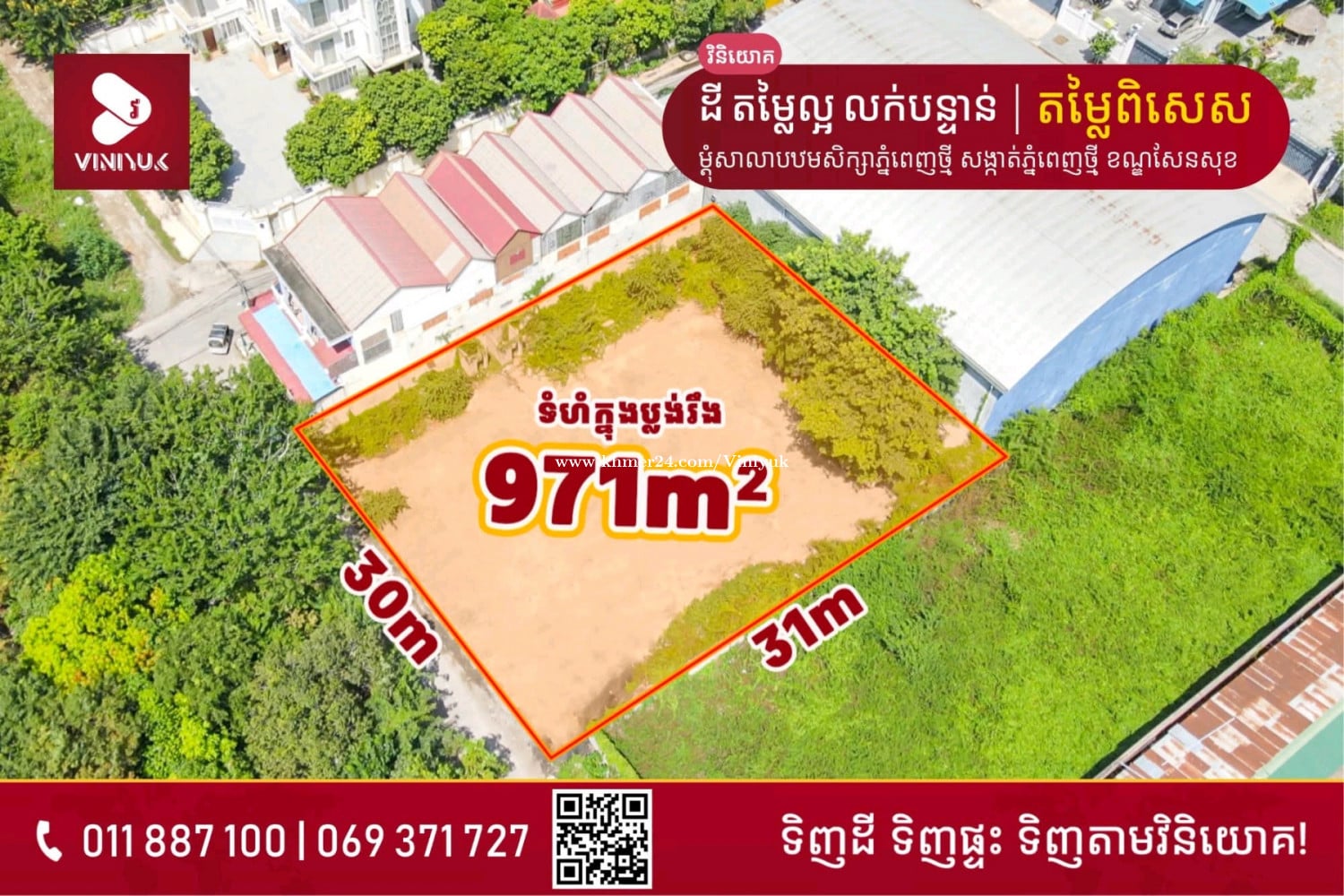 ដីលក់ នៅភ្នំពេញថ្មី តម្លៃល្អ !! - ទីតាំង ៖ នៅសង្កាត់ភ្នំពេញថ្មី ខណ្ឌសែនសុខ - ទំហំដី ៖ 30m X 31m (ក្នុងប្លង់971m²) - តម្លៃ ៖ តម្លៃពិសេស - កាត់ប្លង់រឹង L-Map - ផ្លូវមុខដីទំហំ 12ម៉ែត្រ - លេខអាជ្ញាប័ណ្ណ : E-22-404 📲សូមធ្វើការទំនាក់ទំនង ៖ 011887xxxClick To Call | 010887xxxClick To Call 011371xxxClick To Call | 069371xxxClick To Call 🔸🔸🔸🔸🔸🔸🔸🔸🔸🔸🔸🔸 Facebook : facebook.com/viniyuk Telegram : t.me/viniyuk TikTok : tiktok.com/@viniyukrealestate #ដីលក់ #landforsale #សង្កាត់ភ្នំពេញថ្មី #សែនសុខ #វិនិយោគ