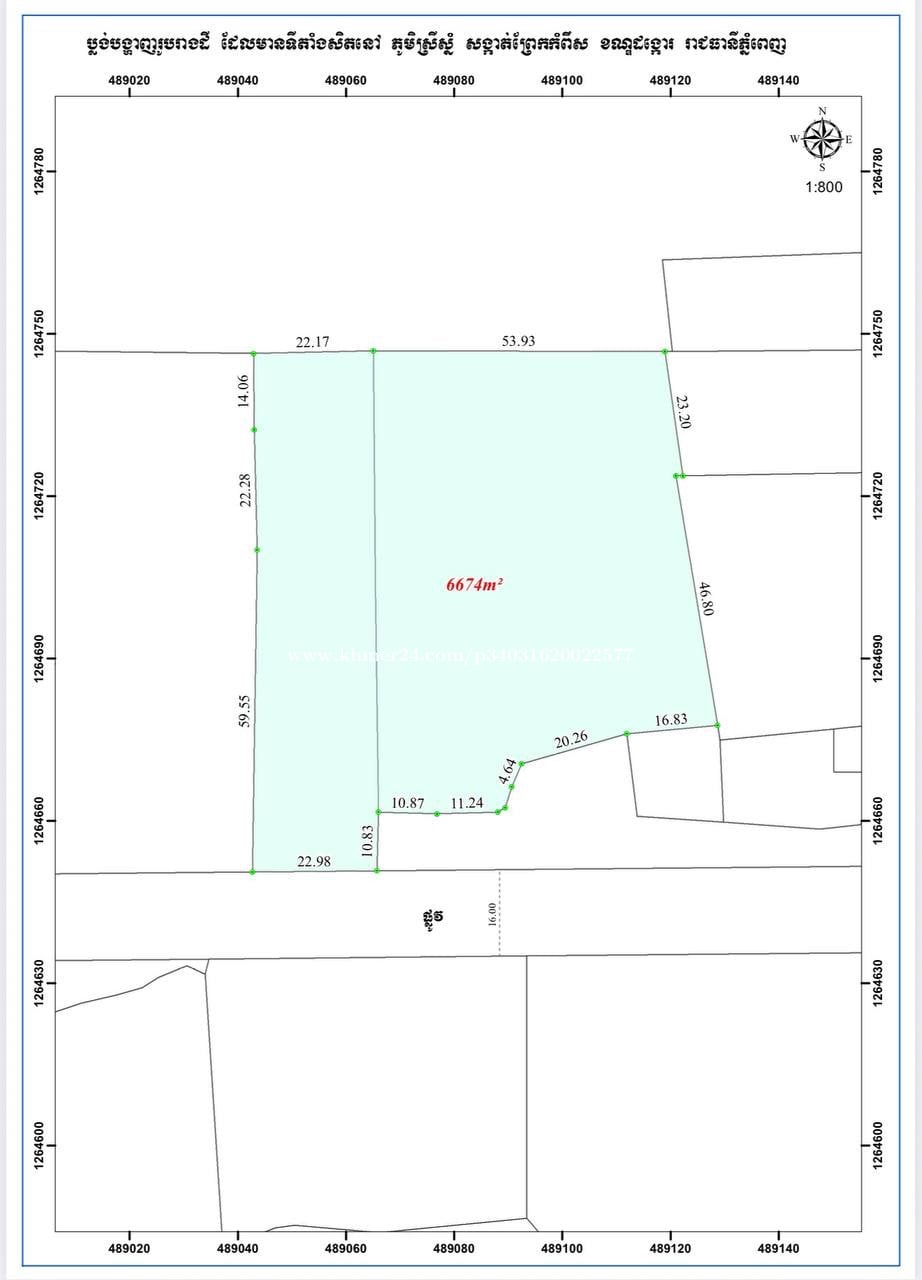 ដីសំរាប់ធ្វើឃ្លាំង រោងចក្រ ទីតាំងល្អ 200m ពីផ្លូវជាតិលេខ២ និង បុរីពិភពថ្មីគួរស្រូវ២ 800m ពីផ្សារខេម៉ល២។ ផ្លូវមុខដី១៦ ម៉ែត