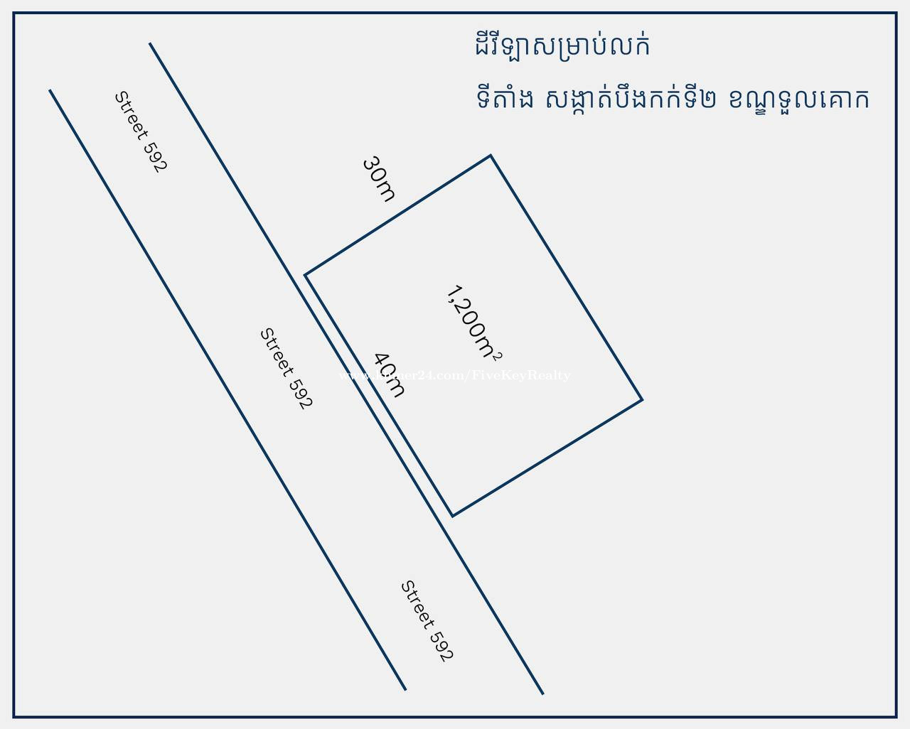 📍 ទីតាំងដីស្ថិតនៅផ្លូវធំ (ផ្លូវ592) ផ្លូវអាជីវកម្ម សង្កាត់បឹងកក់២ ខណ្ឌទួលគោក ក្រុងភ្នំពេញ ■ ទំហំដី: 40m x 30m 💰 តម្លៃលក់: $2, xxx m2/(ចរចា) ទីតាំងល្អ នៅផ្លូវធំ (ផ្លូវអាជីវកម្ម) ល្អបំផុតសម្រាប់សាងសង់ផ្ទះវីឡា សណ្ឋាគារ អគារខុនដូ អាផាត់មិន អគារការិល័យ សាលាអន្តរជាតិ មន្ទីរពេទ្យ និងសម្រាប់អាជីវកម្មគ្រប់ប្រភេទ។ ទាក់ទងមកយើងឥឡូវនេះសម្រាប់ព័ត៌មានលម្អិត: ☎️ Tel: +8557860xxxClick To Call0 (Telegram/LINE/WhatsApp/Wechat) 🌐 More properties: www.fivekeyrealty.com =========== ដើម្បីទទួលបាន ព័ត៌មានអចលនទ្រព្យ ល្អៗ តម្លៃល្អៗ តម្លៃលក់បន្ទាន់ សូមចូលទៅកាន់ CHANNEL តេលេក្រាម Join US: https://t.me/joinchat/PDAU5_OLzE5iNDk1 លោកអ្នក នឹងទទួលបានព័ត៌មានល្អៗ អំពីតំលៃអចលនវត្ថុទូទាំងប្រទេសកម្ពុជា ។
