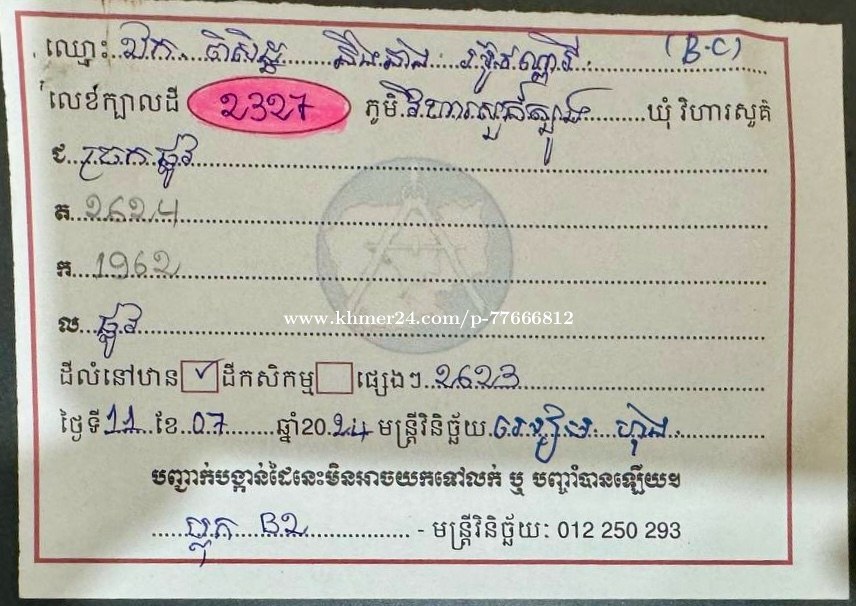 ដីឡូកំពុងតែមានហាងឆេងខ្ពស់នៅតំបន់កំពុងអភិវឌ្ឍន៍ខ្លាំង ដីលក់ 7NG (Block B2) ទំហំ 5m x 20m ក្នុង 01ឡូត៍ ប្លង់រឹង ផ្លូវមុខផ្ទះ 8m ជិតគម្រោងផ្សារ - ជិតតំបន់ទីប្រជុំជន - ជិតវត្តវិហាសួរហ៍ - ជិតតំបន់កំសាន្ត Sky Land ដែលកំពុងតែទាក់ទាញភ្ញៀវទេសចរណ៍យ៉ាងច្រើនកោះករ - រិតតែពិសេសជាងនេះទៅទៀតនោះគឺនៅជំវិញដី ហំពទ្ធទៅដោយរោងចក្រ 16រោងចក្រ ហើយរោងចក្រដែលធំ ហើយ នៅជិតដីនោះគឺរោងចក្រទី8 ( Crystal-Martin ( Cambodia ) Limited ) ដែលមានកម្មករនឹងបុគ្គលិក ជាង6500នាក់ - មិនត្រឹមតែប៉ុណ្ណោះមាន ធានគា ( UCB ) នឹង មិន្ទពេទ្យបង្អែកវិហាសួរហ៍នៅទីនោះផងដែល - ទីតាំងដីស្ថិតនៅ ភូមិស្វាយមាស ឃុំវិហាសួរហ៍ ស្រុកខ្សាច់កណ្តាល ខេត្តកណ្តាល ទីតាំងដី៖ ក្នុងគំរោងក្រុមហ៊ុន 7NG (https://maps.app.goo.gl/KWTWcqWb8XrvogVX8) លេខទូរស័ព្ទ៖ 077 666 812