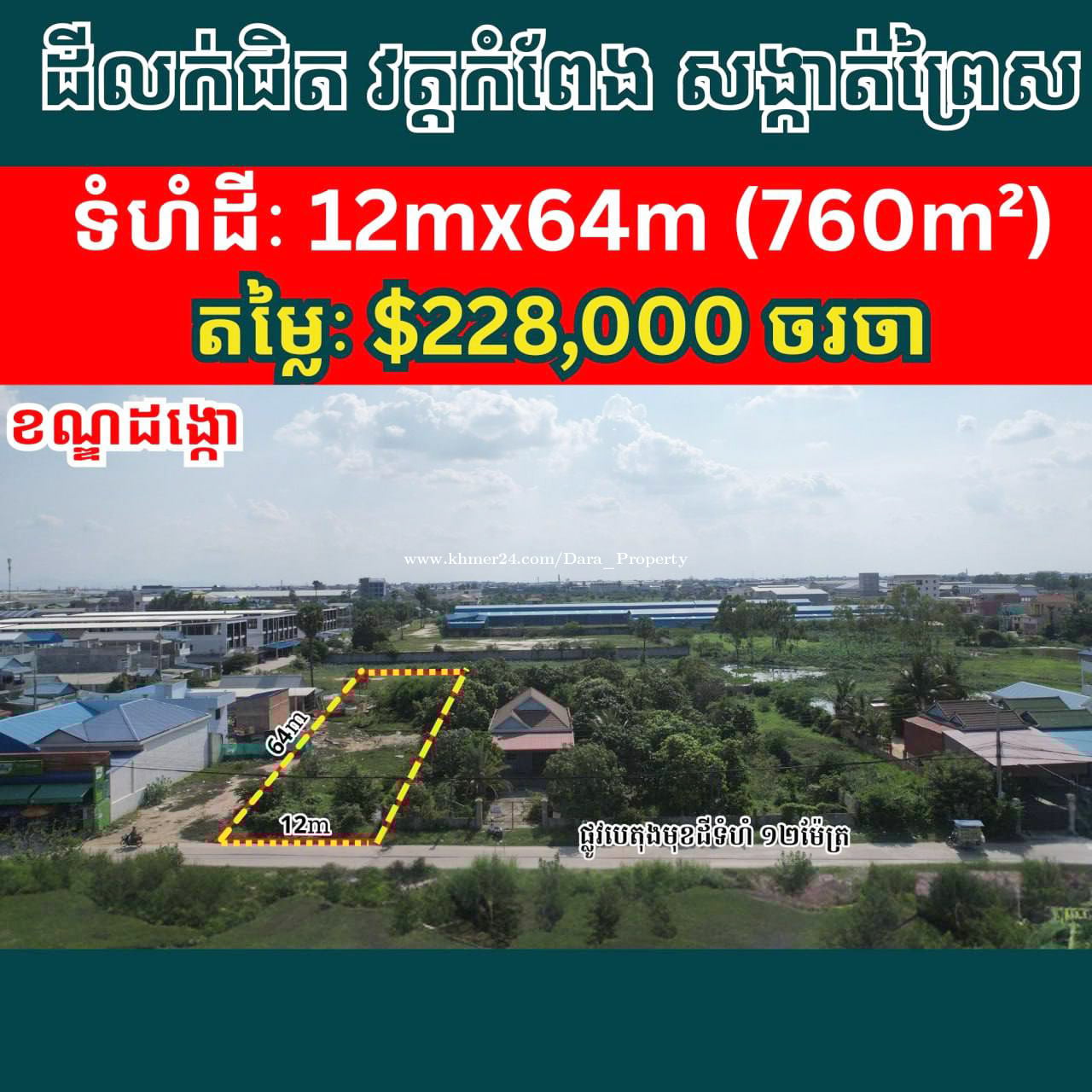📣 ដីលក់បន្ទាន់ | Land for sale urgently - តម្លៃលក់ | Sale price: $228,000 (ចរចាបាន) - ទំហំដី | Land size: 12m x 64m (ក្នុងប្លង់រឹង 760m²) - ចុះពីផ្លូវសន្តិភាព ប្រហែល ៤០០ម៉ែត្រ។ - ផ្លូវបេតុងមុខដីទំហំ ១២ម៉ែត្រ - ជិតផ្លូវសន្តិភាព សង្កាត់ព្រៃស ខណ្ឌដង្កោ រាជធានីភ្នំពេញ 📣*ពត៌មានបន្ថែម សូមធ្វើការទំនាក់ទំនងតាមលេខទូរស័ព្ទៈ 📞092511xxxClick To Call | 086311xxxClick To Call សូមអរគុណ! Boss