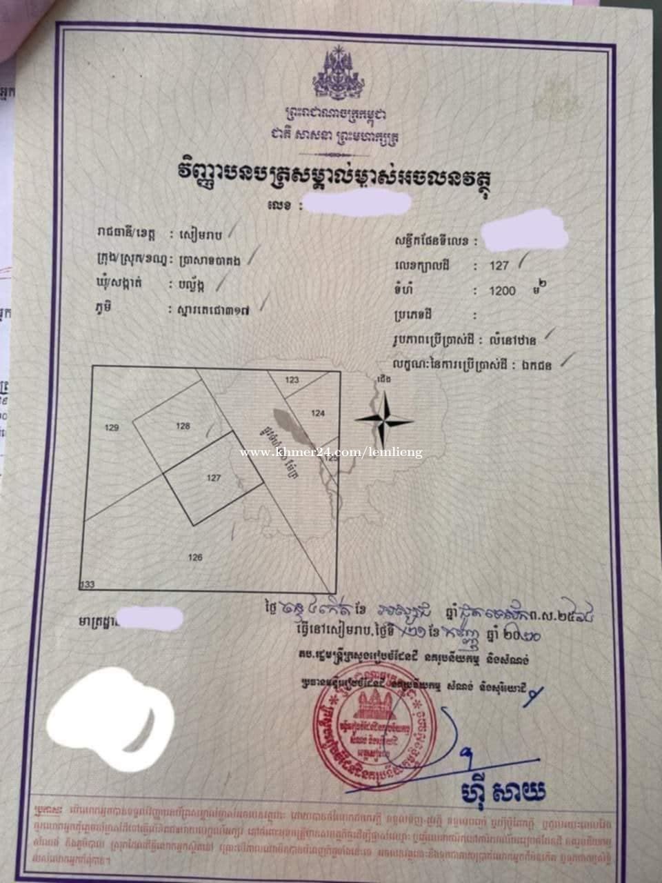 ដីលក់បន្ទាន់ 1,5ហិចតា តំលៃក្រោមទីផ្សារ 1ម៉ែត្រការ៉េ 25$ ប្លង់រឹង ទីតាំងល្អនីជាប់នឹងផ្លូវថ្នល់ជាតិ ជាប់ផ្លូវកែង នៅជិតកន្លែងកំសាន្ត ត្រាកុដ និង សាលាប៉ូលីសខេត្តសៀមរាប ក្នុងទីប្រជុំជនមានប្រជាជនរស់នៅកុះករ ដីមានជីវជាតិល្អ អាចធ្វើជាចំការ ដាំដំណាំបានល្អ