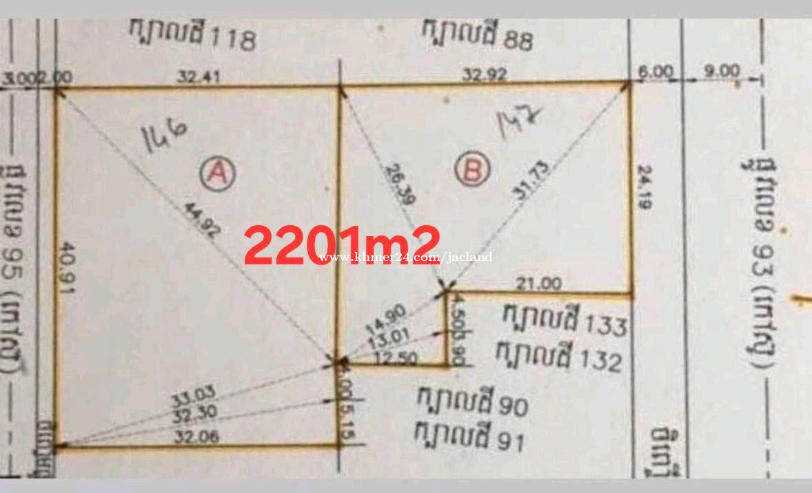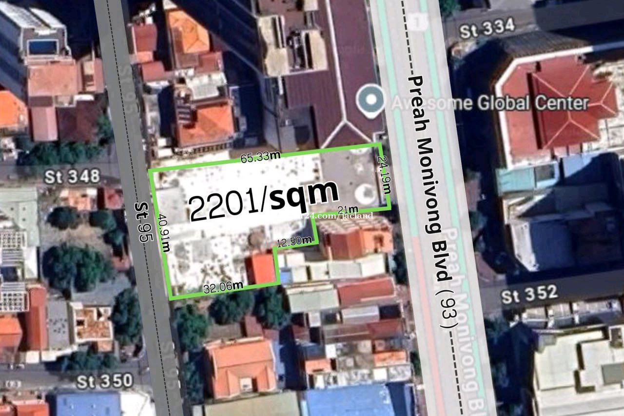 ដីលក់ផ្លូវមុខក្រោយលើវិថីមុន្នីវង្ស | Land for Sale with Double Frontage on Monivong Blvd 💥តម្លៃ | Price: $8,500/m² (Negotiable) ✅ទំហំដីសរុប | Total Land Area: 2,201m² ប្រភេទប្លង់ | Title Type: ប្លង់រឹង (Hard Title) 📏ទំហំដីផ្លូវមុខក្រោយ | Double Frontage Dimensions: • ជាប់វិថីព្រះមុន្នីវង្ស | Facing Monivong Blvd (93): 24m • ជាប់ផ្លូវលេខ 95 | Facing Street 95: 40m • ជម្រៅដី | Land Depth: 65m 📍ទីតាំង | Location: ភូមិ៧, សង្កាត់បឹងកេងកងទី៣, ខណ្ឌបឹងកេងកង, រាជធានីភ្នំពេញ។ Phum7, Sangkat Boeung Keng Kang 3, Khan Boeung Keng Kang, Phnom Penh This is a central, prime commercial location in Phnom Penh. 📌Google Maps: https://maps.app.goo.gl/Ar9bSduTAxBa6K156 ✨លក្ខណៈពិសេស | Key Features: ដីផ្លូវមុខក្រោយដ៏កម្រ និងមានសក្តានុពលខ្ពស់សាកសមសម្រាប់ អគារការិយាល័យ, សណ្ឋាគារ, ឬខុនដូប្រណិត។ Rare double-frontage commercial land on a main boulevard, ideal for a high-rise office tower, hotel, or luxury condominium.