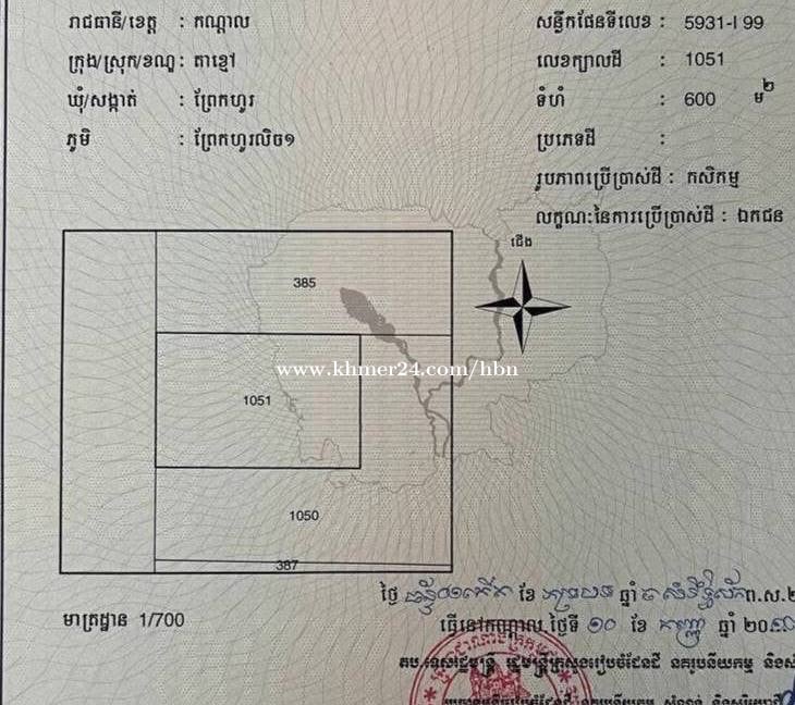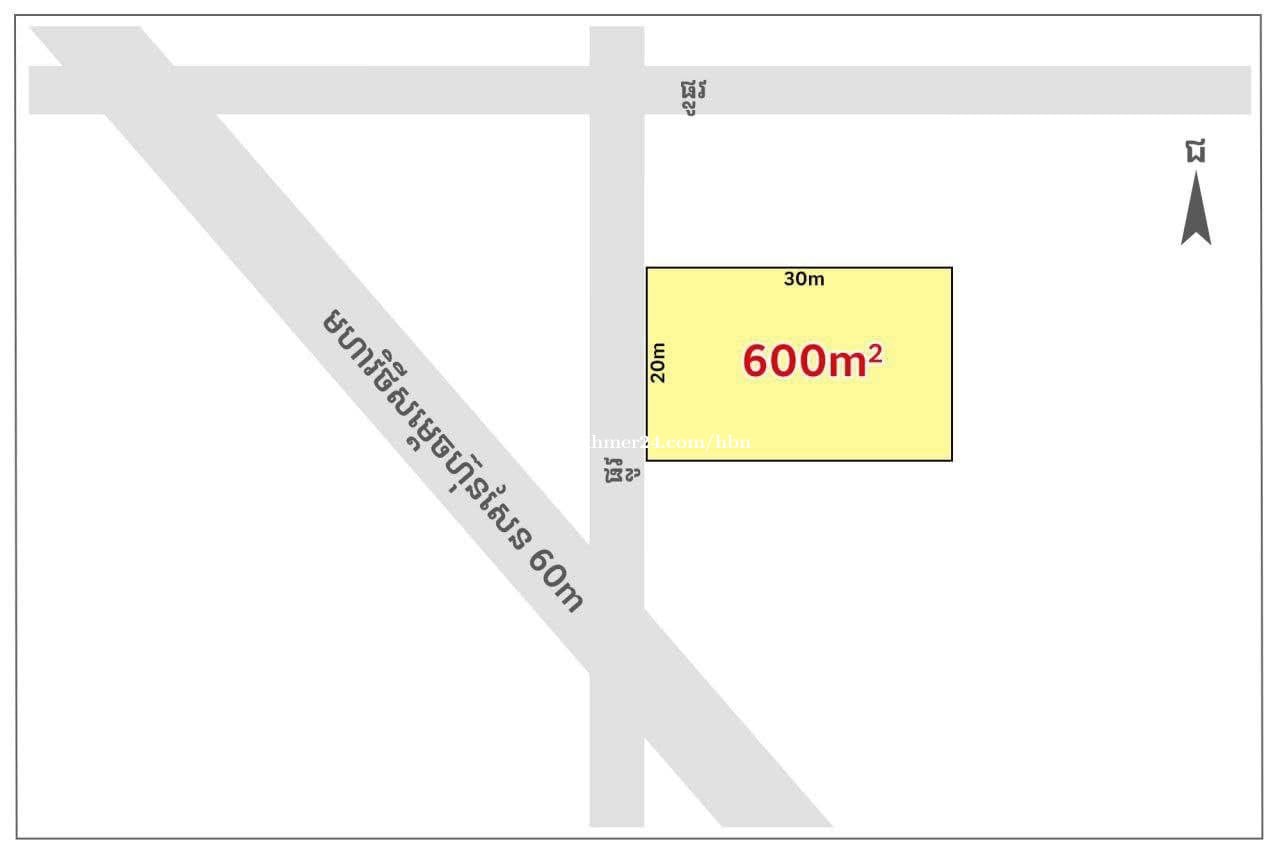 ដីលក់ ជាប់ផ្លូវទទឹង (30m) ចុះពីផ្លូវ80mចូលព្រលាន (ចម្ងាយ 200m) ជិតផ្លូវជាតិលេខ2 សង្កាត់ព្រែកហូរ ក្រុងតាខ្មៅ • ទំហំ : 20mx30m (600m²) • តម្លៃ : $335,000 (ចរចា) • បងរឹង L-Map