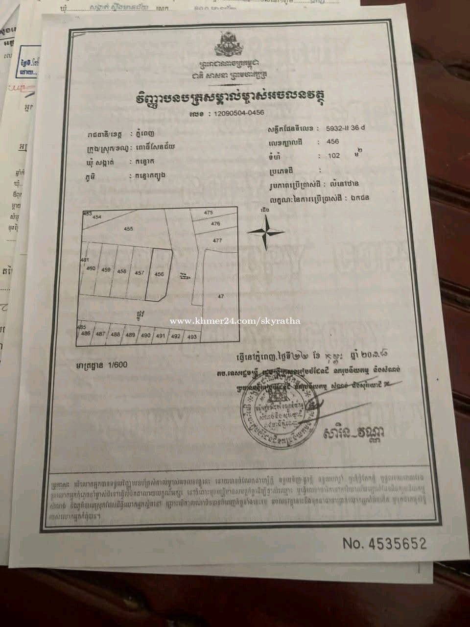 ដីលក់ ទំហំ 7m x 20m ប្លង់រឹង ភូមិកន្ទោងត្បូង សង្កាត់ កន្ទោក ខណ្ឌកំបូល តំលៃ២០០០០$ ២ម៉ឺន ចរចា