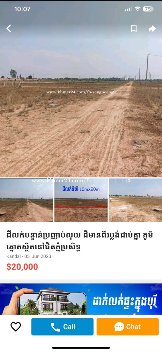 ដីលក់បន្ទាន់ដីមាន២ប្លង់ជាប់គ្នា ១ប្លង់មានទំហំ ៥*20mតម្លៃ 4000$១ប្លង់ 2ប្លង់7000$