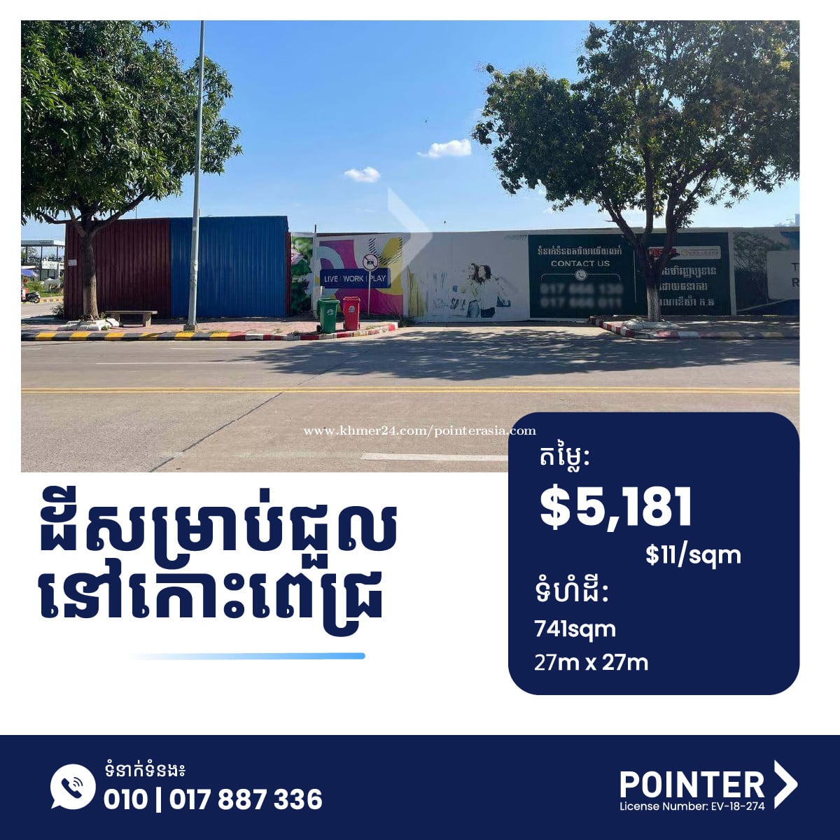 ដីសម្រាប់ជួលនៅកោះពេជ្រ - Land for Rent in Koh Pich 💸 តម្លៃលក់: $ 5,181 $11/ម៉ែត្រការ៉េ ✅ ក្បាលដី 27 ម៉ែត្រ | ជម្រៅ 27 ម៉ែត្រ ✅ ទំហំដី: 741 ម៉ែត្រការ៉េ 📍សង្កាត់ទន្លេបាសាក់, ខណ្ឌចំការមន 📌លេខកូដអចលនទ្រព្យ: LND-001775 🔗ព័ត៌មានបន្ថែម៖ https://pointer.asia/C3V3r 📞លេខទំនាក់ទំនង: 010887xxxClick To Call ✈️Telegram: t.me/Pointerproperties