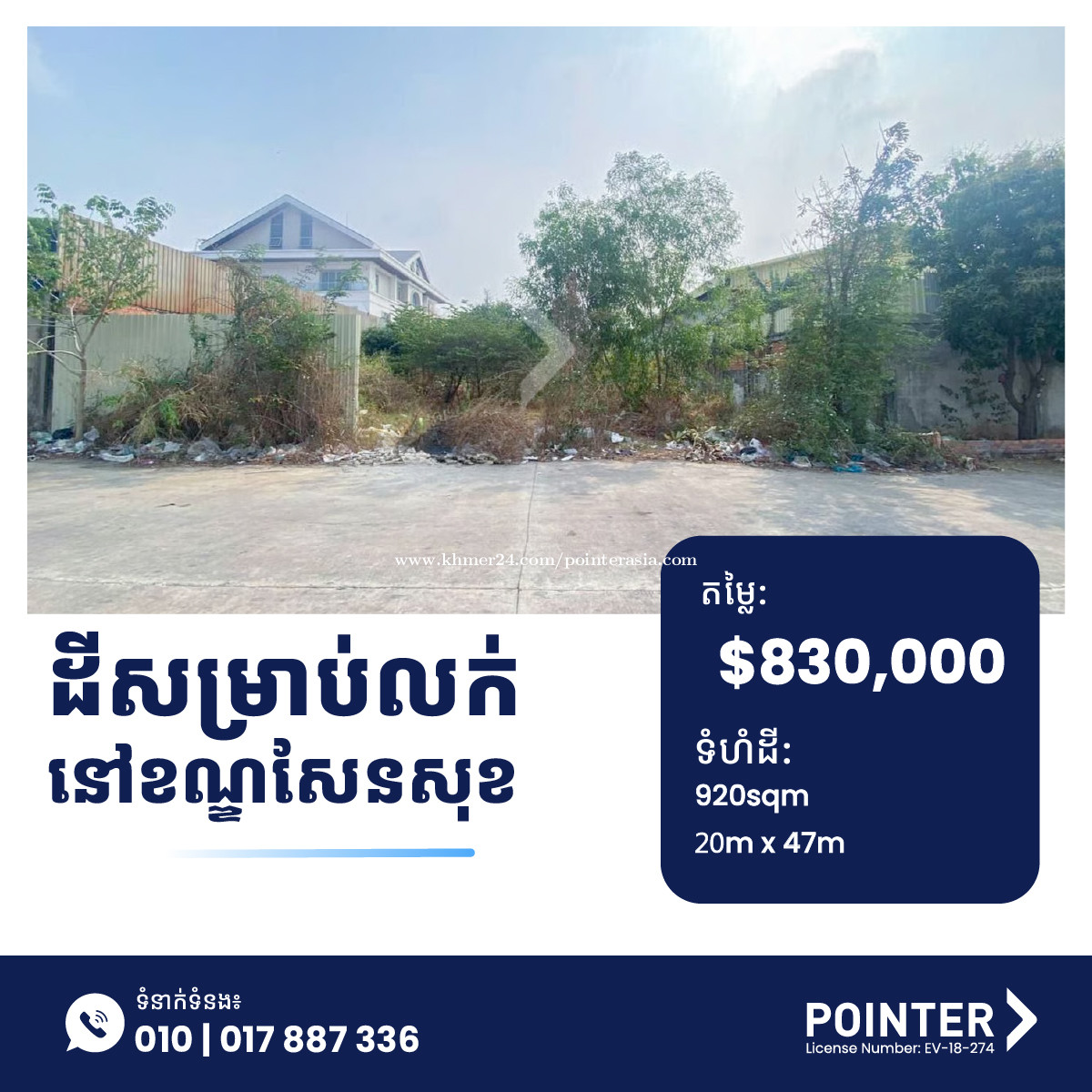 ដីសម្រាប់លក់នៅក្នុងខណ្ឌសែនសុខ - Land for Sale in Khan Sen Sok 💸 តម្លៃលក់: $830,000 ✅ ក្បាលដី 20 ម៉ែត្រ | ជម្រៅ 47 ម៉ែត្រ ✅ ទំហំដី: 920 ម៉ែត្រការ៉េ ✅ សាកសមបំផុតសម្រាប់ការសាងសង់ជាផ្ទះវីឡា ឬក៏ជាទីតាំងអាជីវកម្មផ្សេងៗ 📍សង្កាត់អូរបែកក្អម, ខណ្ឌសែនសុខ 📌លេខកូដអចលនទ្រព្យ: LND-001742 🔗ព័ត៌មានបន្ថែម៖ https://pointer.asia/FLdEu 📞លេខទំនាក់ទំនង: 010887xxxClick To Call ✈️Telegram: t.me/Pointerproperties