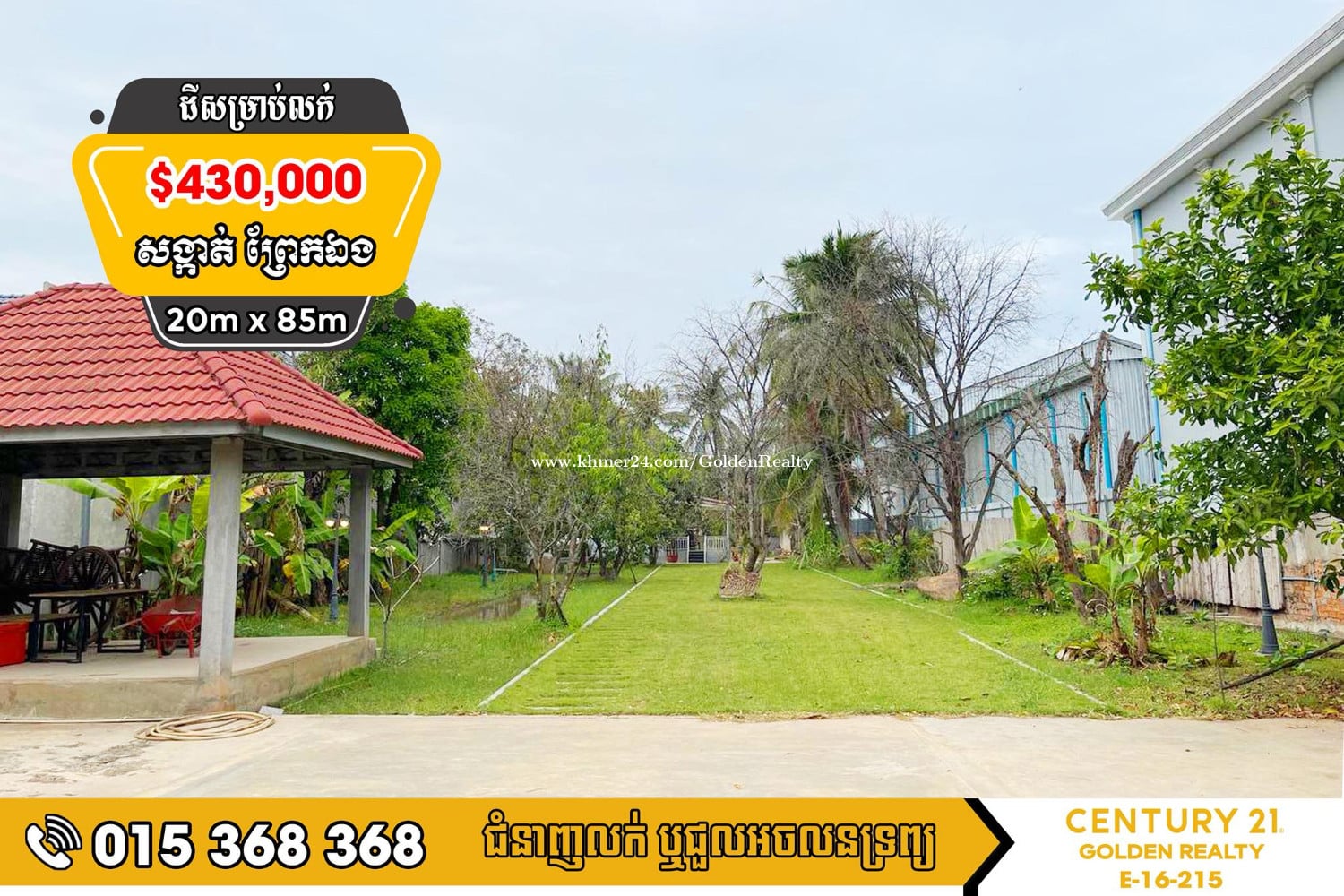 ដីសម្រាប់លក់#ព្រែកឯង#ច្បារអំពៅ# 200ម៉ែត្រពីផ្លូវ(St:114Tiger) 🚩តម្លៃត្រឹមតែ $430,000 (ចរចា+កាត់ប្លង់រឹងជូន) 🚩ទីតាំងសង្កាត់ព្រែកឯង,ខណ្ឌច្បារអំពៅ រាជធានីភ្នំេពញ។ 👉 ទំហំដី:20mx85m 👉អាចវិនិយោគទុកចំណេញ 👉តំបន់បុរីកំពុងសាងសង់ 👉មានផ្លូវធំទូលាយជាច្រើន ងាយស្រួលក្នុងការធ្វើដំណើរ សំរាប់ព័ត៌មានលម្អិតសូមទំនាក់ទំនងមកទូរស័ព្ទលេខ ☎️ 015368xxxClick To Call / 099655xxxClick To Call / 0236558xxxClick To Call 📩Telegram t.me/c21goldenrealtyhotline