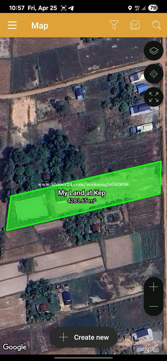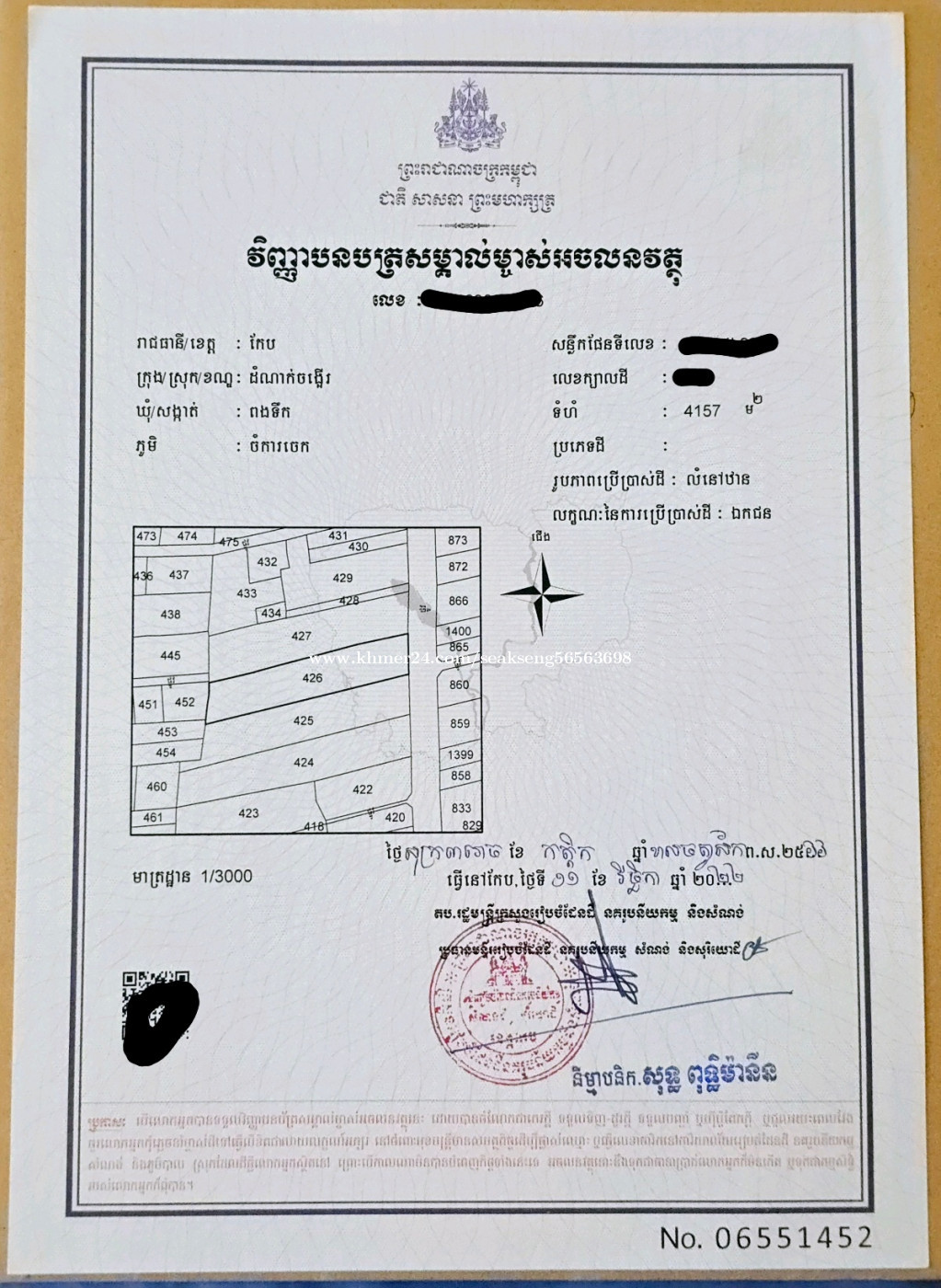 ដីនៅកែប ស្រុកដំណាក់ចង្អើរ ធ្វើរបងរួច ចាក់ដីរួច មានដើមឈើហូបផ្លែ មានស្រះទឹក មានកញ្ចុះ និងបន្ទប់ទឹក សាកសមសម្រាប់សាងសង់ផ្ទះរស់នៅ ផ្ទះលំហែរ ផ្ទះត្រជៀកកាំ