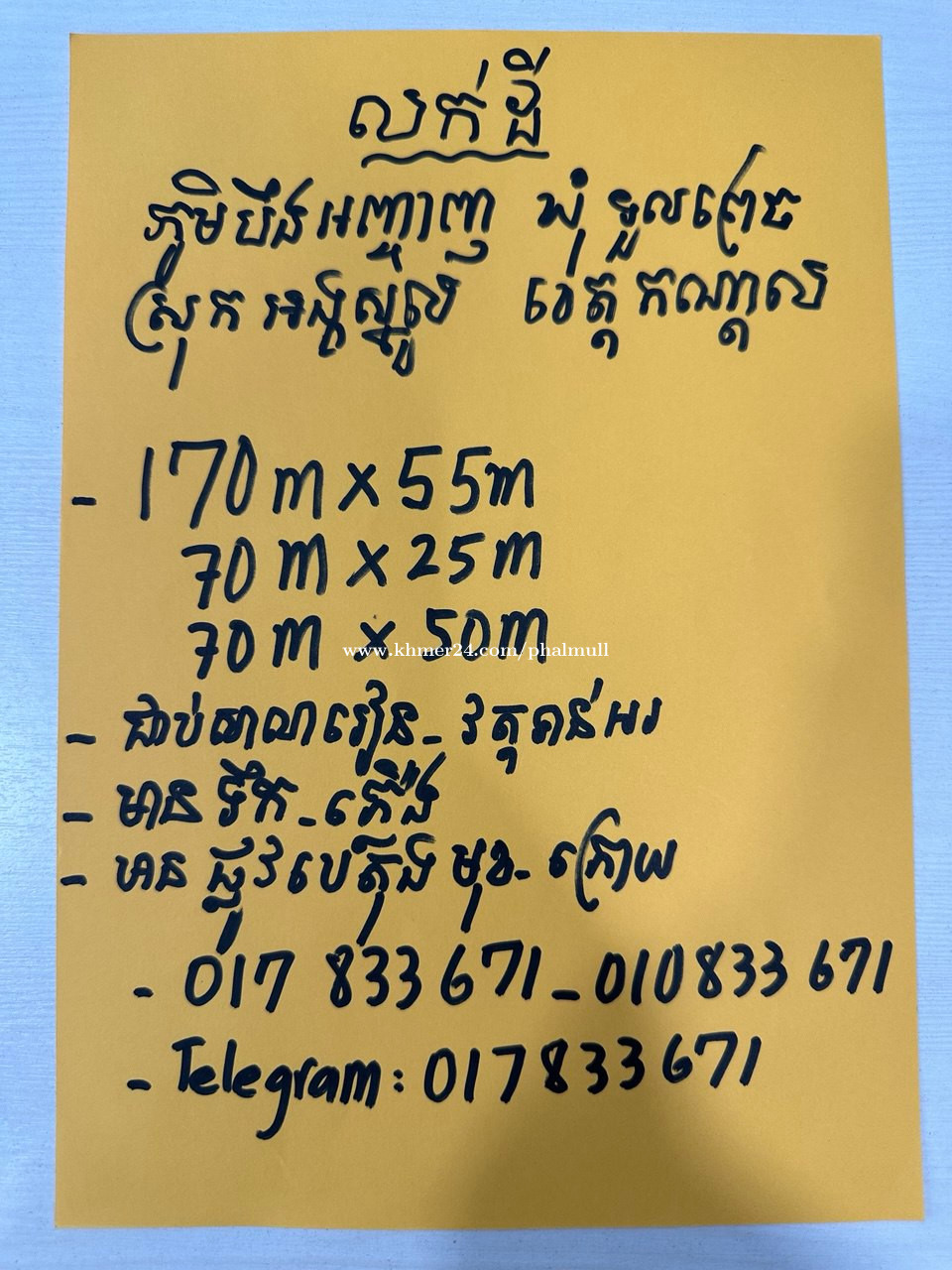 លក់ដី បន្ទាន់ក្នុងតំឡៃធូថ្លៃ (មានគ្រប់ទំហំ ជិតអនុវិទ្យាល័យ ជិតវត្តអារាម ជិតមណ្ឌលកុមារកំព្រា) មានផ្លូវបេតុង មុខ ក្រោយ មានបណ្តាញទឹកស្អាត មានអគ្គិសនី ដីអាចធ្វើរោងចក្របាន ឃ្លាំង និងការដ្ឋានសំណង់ ឬពុះដីឡូក៍បាន ទំហំដី 170mx55m 70mx25m 70mx50m 017833xxxClick To Call (Telegram) 010833xxxClick To Call Google map https://maps.app.goo.gl/pzu9NGxp3X8GaWWN9?g_st=it