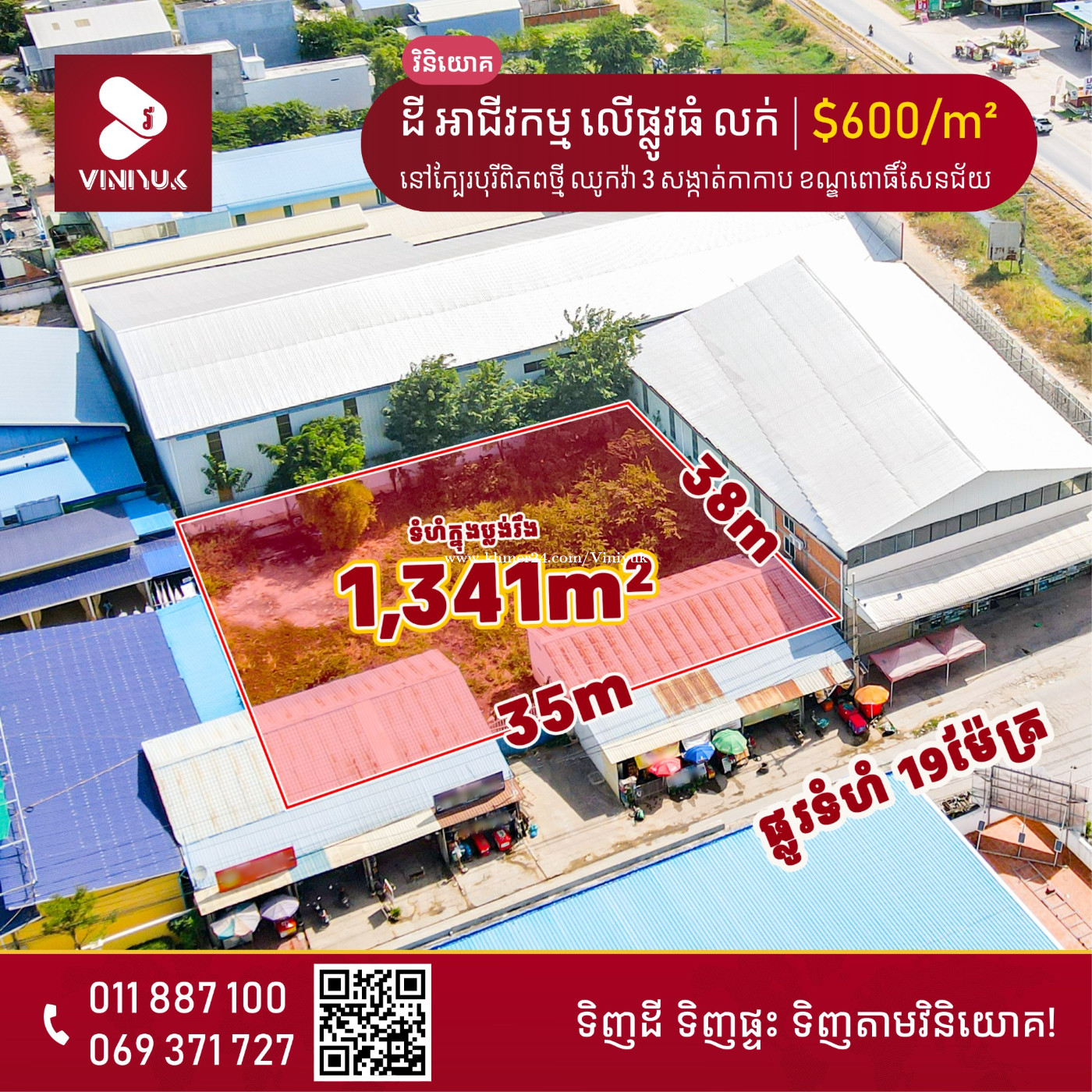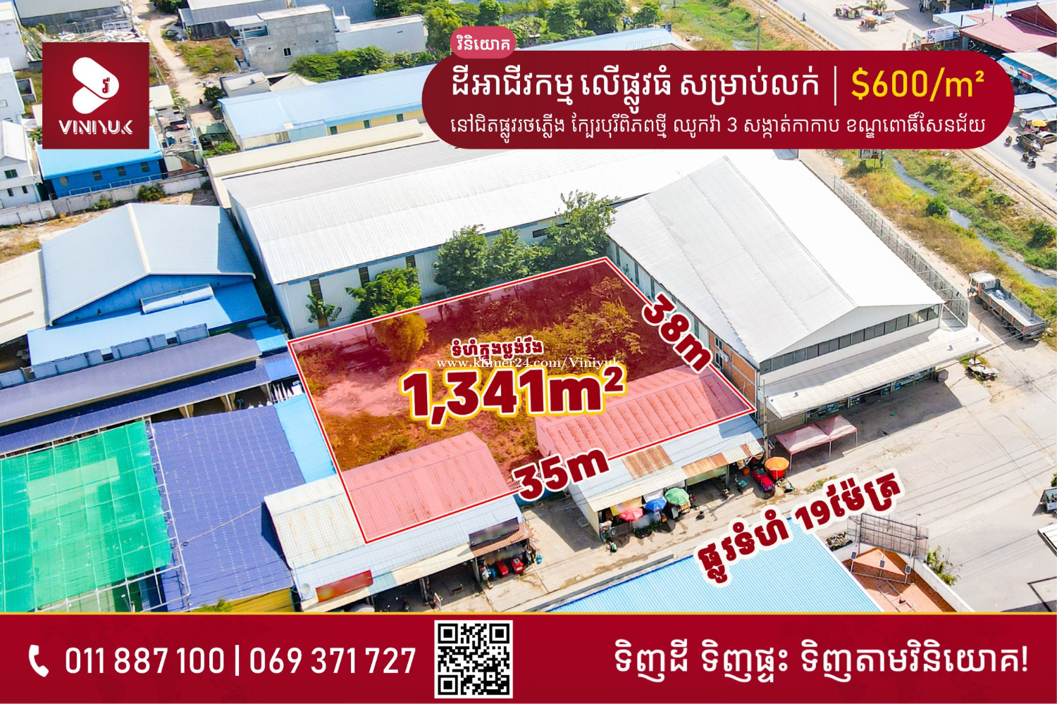 🏡ដីអាជីវកម្ម លើផ្លូវធំ សម្រាប់លក់ !! 📍ទីតាំង ៖ នៅជិតផ្លូវរថភ្លើង ក្បែរបុរីពិភពថ្មី ឈូកវ៉ា 3 សង្កាត់កាកាប ខណ្ឌពោធិ៍សែនជ័យ រាជធានីភ្នំពេញ - តម្លៃលក់ $600/m² (ចរចា) - ទំហំដី: 35m x 38m (ប្លង់រឹង 1,341m²) - ផ្លូវមុខដីទំហំ 19m - មានចំណូលពីការជួល $800 ក្នុងមួយខែ - ផ្ទេរកម្មសិទ្ធិប្លង់រឹង - លេខអាជ្ញាប័ណ្ណ : E-22-404