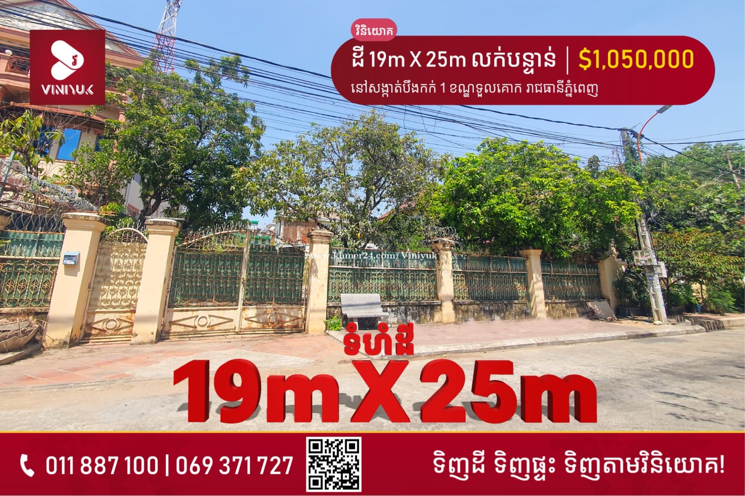 ដី សម្រាបលក់!! 📍 ទីតាំង : នៅសង្កាត់បឹងកក់ 1 ខណ្ឌទួលគោក - ទំហំដី ៖ 19m x 25m (ទំហំក្នុងប្លង់ 479m²) - តម្លៃលក់ ៖ $1,050,000 - នៅលើផ្លូវទំហំ 14 ម៉ែត្រ - បែរទិសកើត - ប្លង់រឹង L-Map