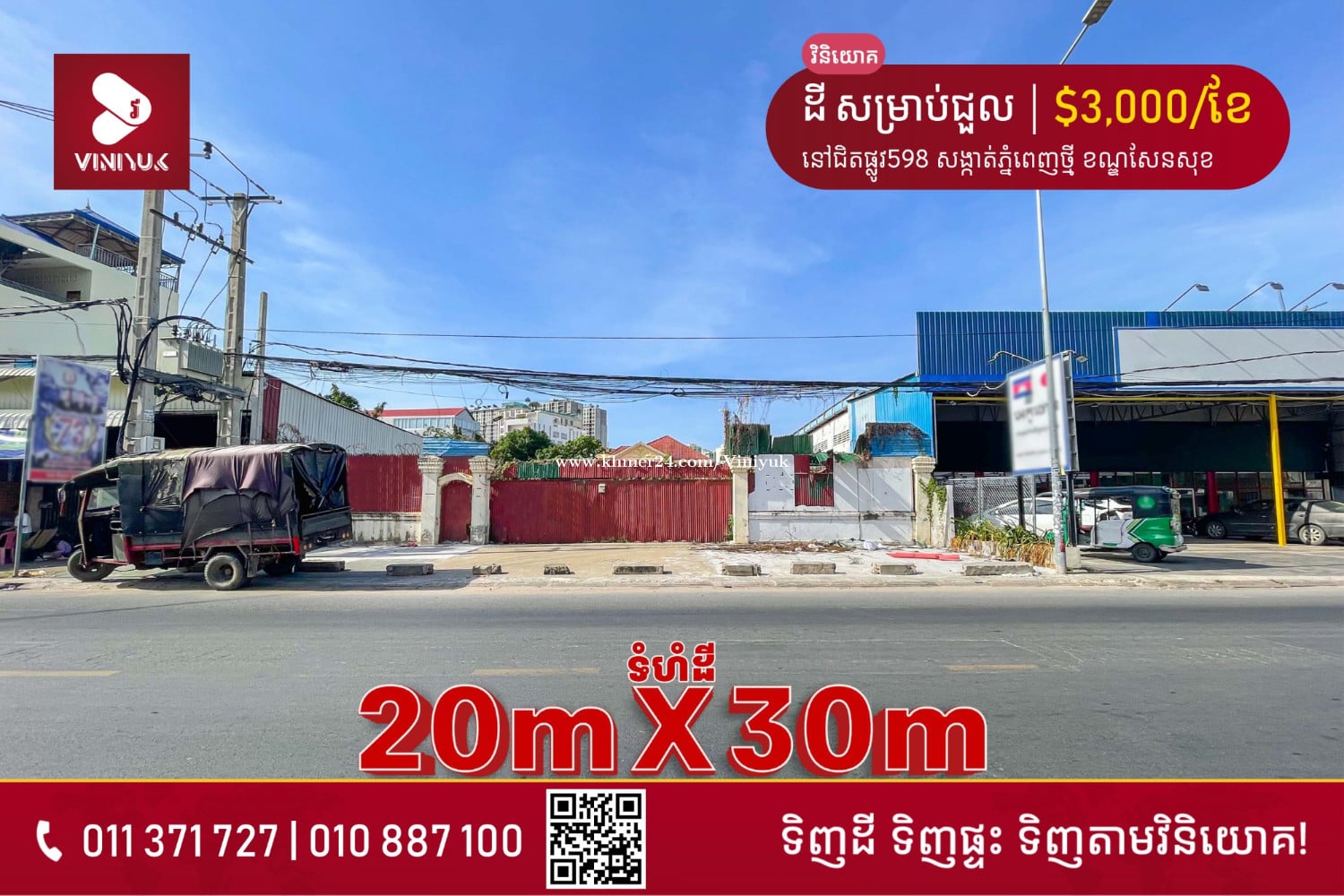 🏡ដី សម្រាប់ជួល !! 📍ទីតាំង ៖ នៅជិតផ្លូវ598 សង្កាត់ភ្នំពេញថ្មី ខណ្ឌសែនសុខ រាជធានីភ្នំពេញ - តម្លៃ ៖ $3,000/ខែ ចរចាបាន - ទំហំដី ៖ 20m X 30m - ទិសបែរលិច - លេខអាជ្ញាប័ណ្ណ : E-22-404