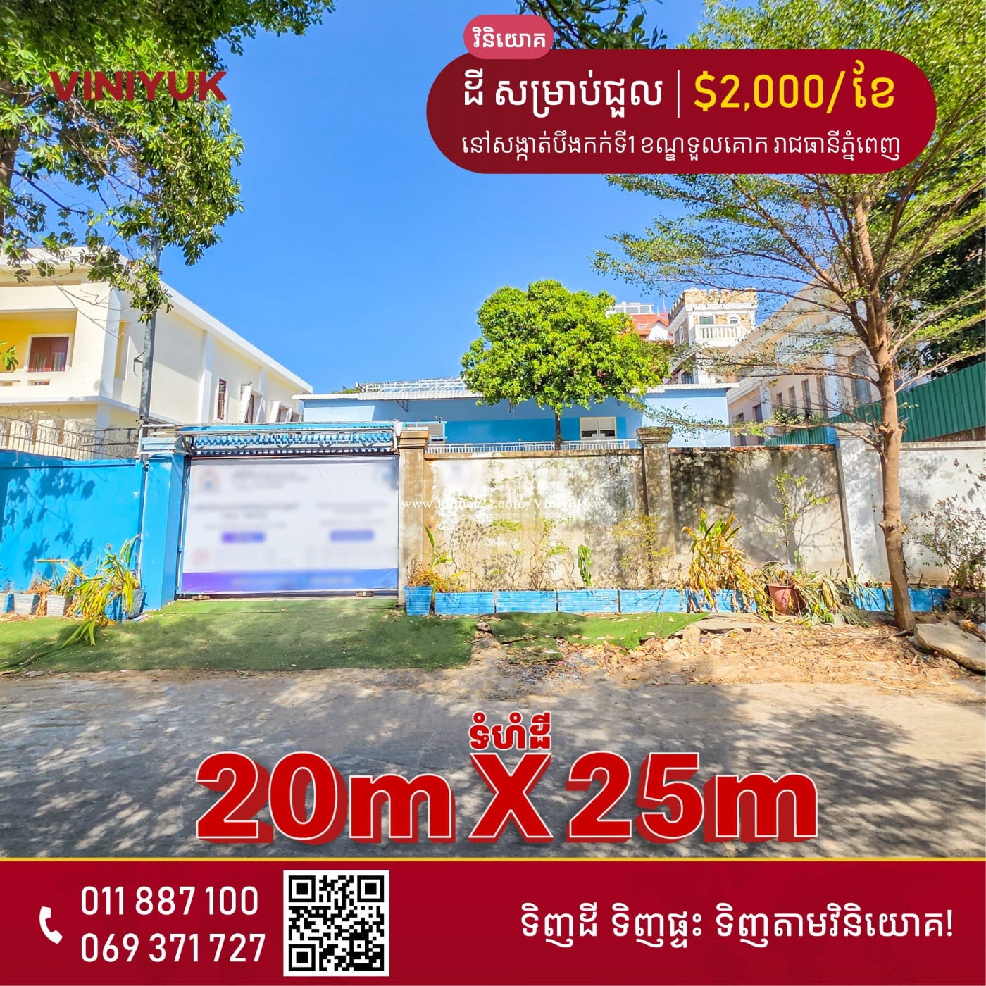 🏡ដី សម្រាប់ជួល!! 📍ទីតាំង ៖ នៅសង្កាត់បឹងកក់ទី1 ខណ្ឌទួលគោក រាជធានីភ្នំពេញ - តម្លៃជួល : $2,000/ខែ ចរចា - ទំហំដី ៖ 20m x 25m - មានបន្ទប់ 5 , បន្ទប់ទឹក 7 - ពីមុនបើកសាលារៀន - កុងត្រាជួល 3 - 5ឆ្នាំ - លេខអាជ្ញាប័ណ្ណ : E-22-404